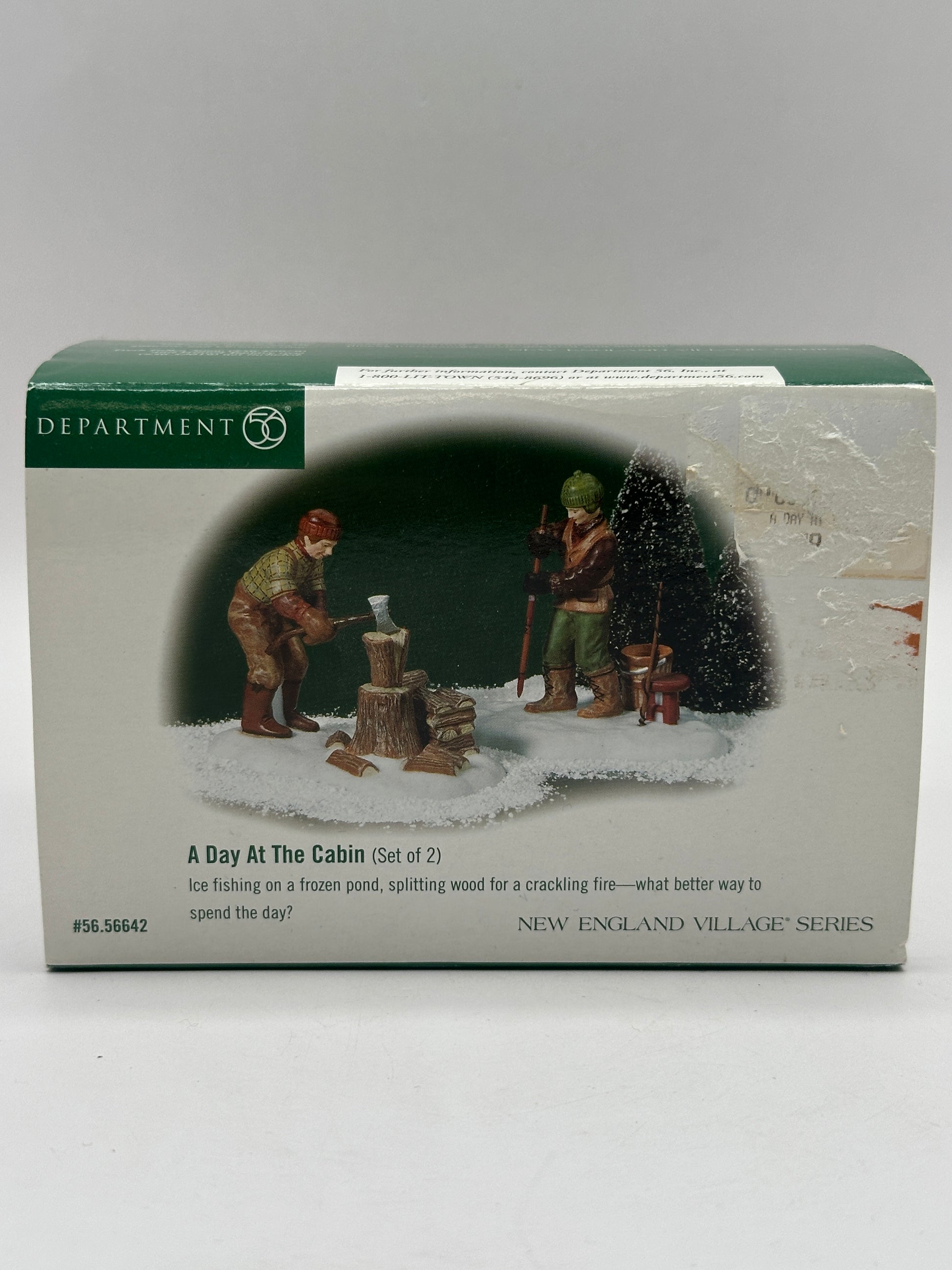 A Day At The Cabin shows the hardworking side of rural life. One man chops firewood while another drills a hole in the ice, preparing for winter tasks and daily chores. This detailed accessory captures the rugged charm and industrious spirit of New England country life.