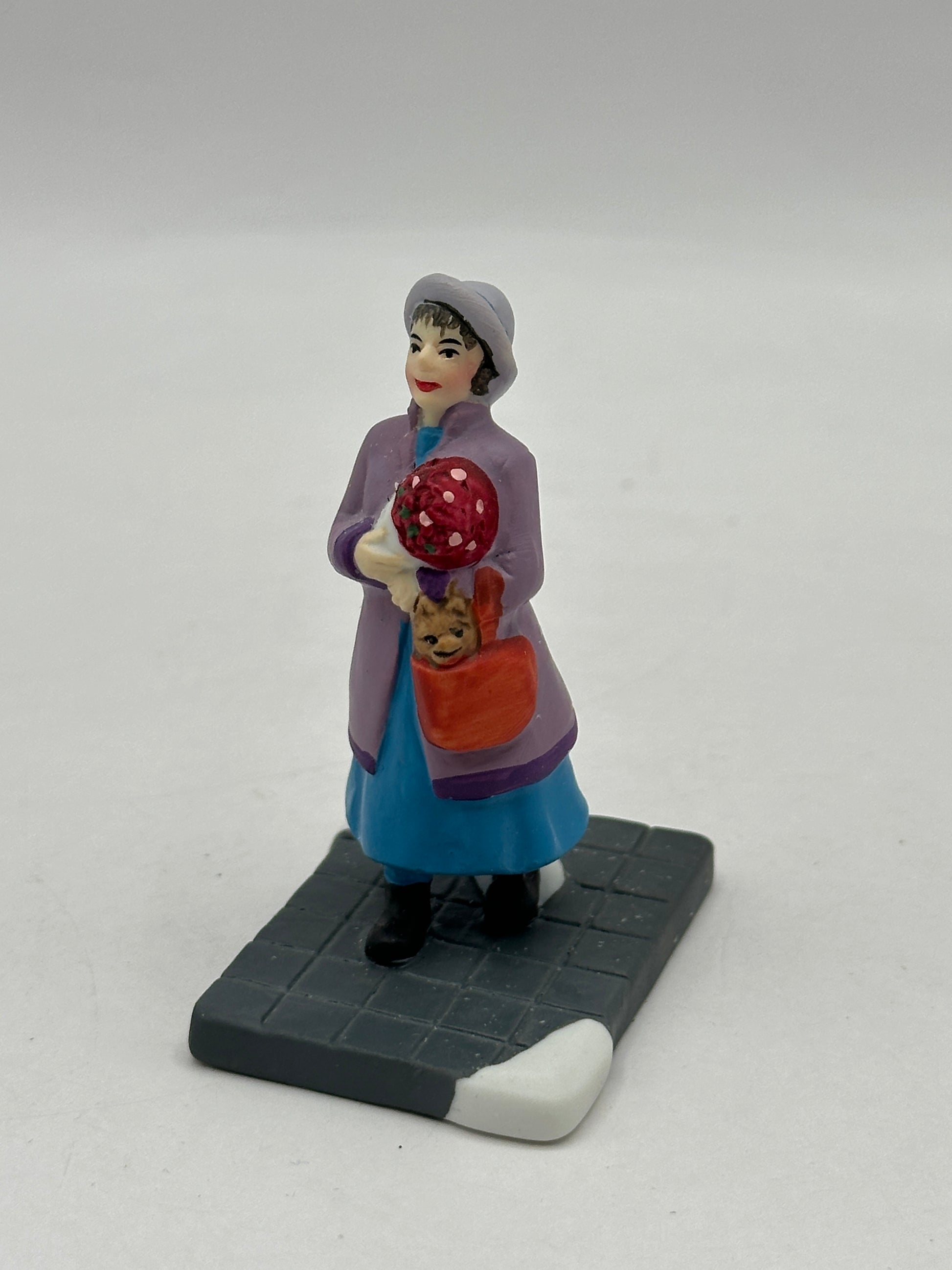 This piece captures a tender moment as a woman carries her small pup in her purse and a fresh bouquet of flowers. This charming figure adds warmth and grace to any village scene, celebrating the simple joys of companionship and a stroll through the city.