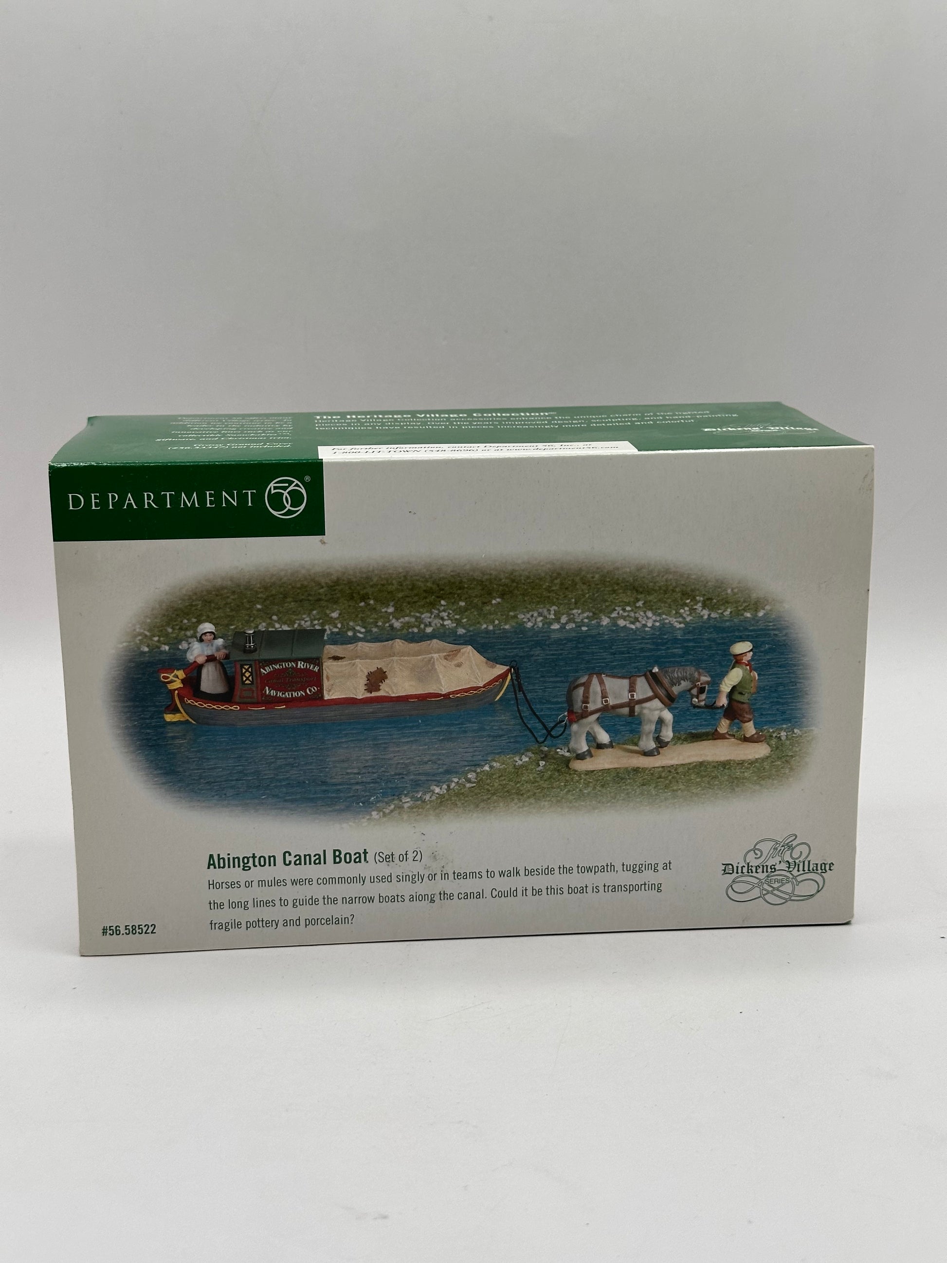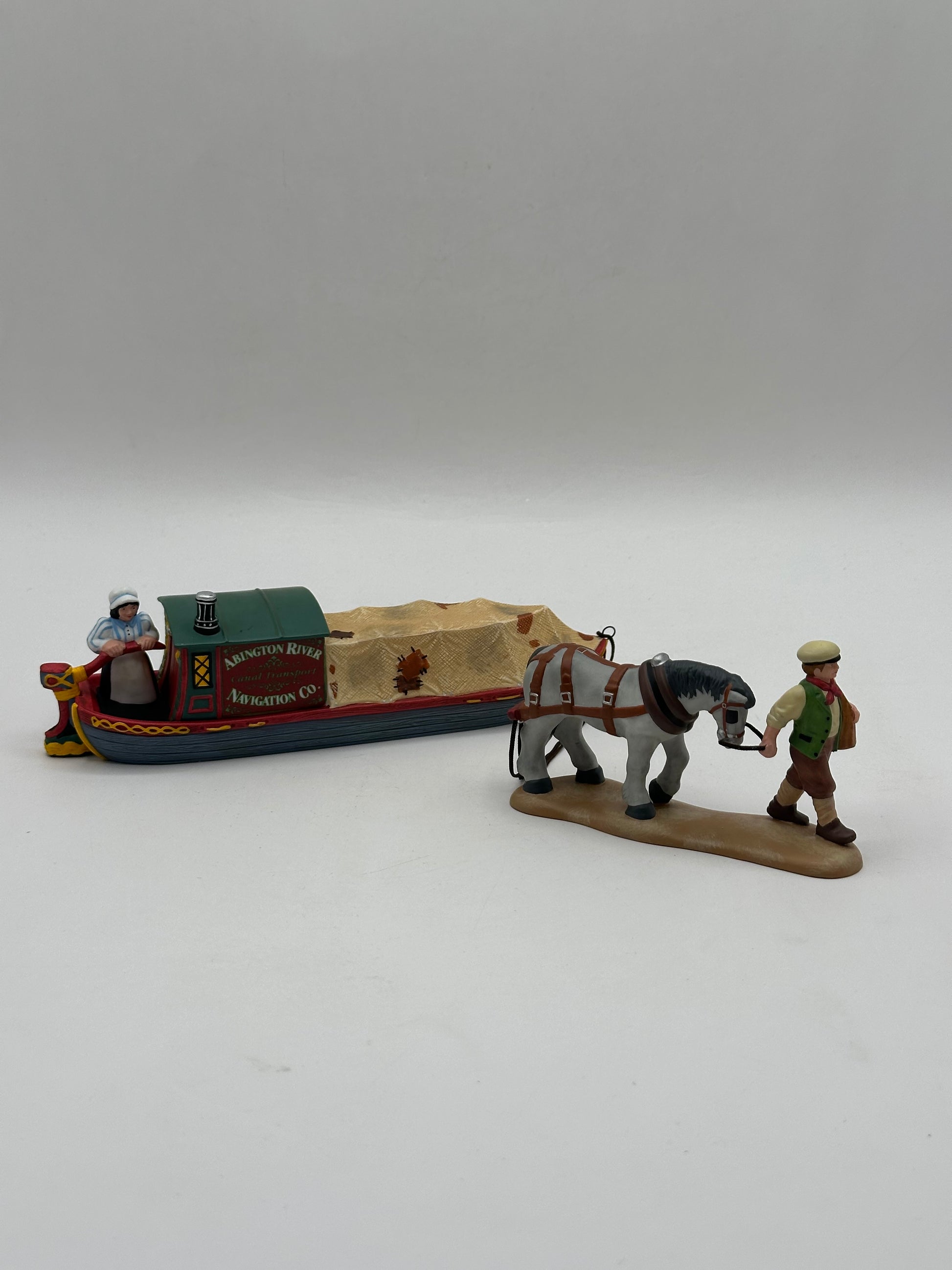 The Abington Canal Boat drifts gently along the quiet waterways of Dickens Village, a humble vessel loaded with parcels, crates, and the necessities of everyday life. Painted in traditional tones and trimmed with charming decorative details, this narrowboat brings a touch of working-class industry to the village scene.