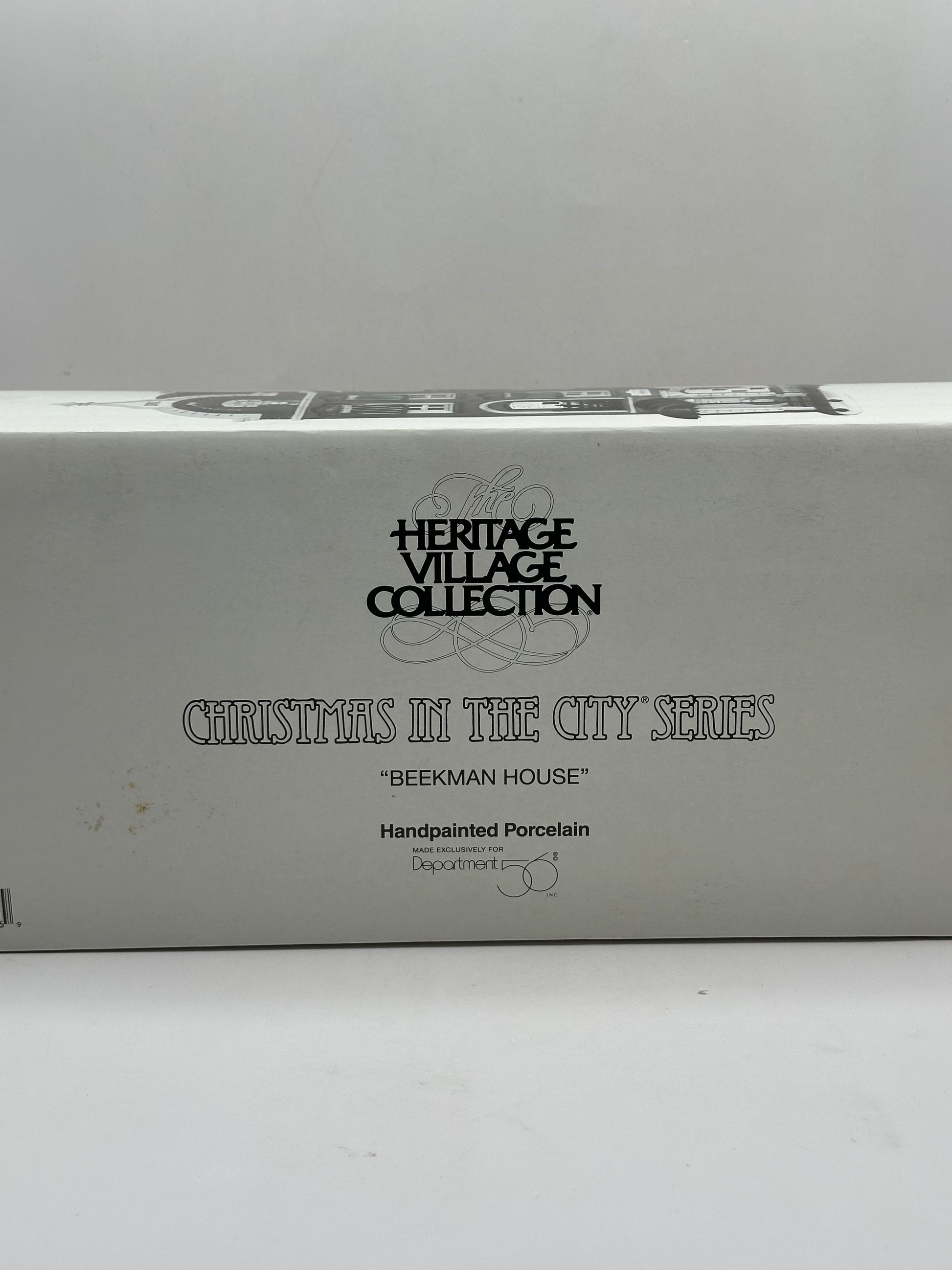 Beekman House is a charming city brownstone, showcasing classic Victorian architectural details with its ornate façade, green awnings, and wrought-iron balconies. The warmly lit windows and welcoming entrance evoke a sense of home and festive cheer.