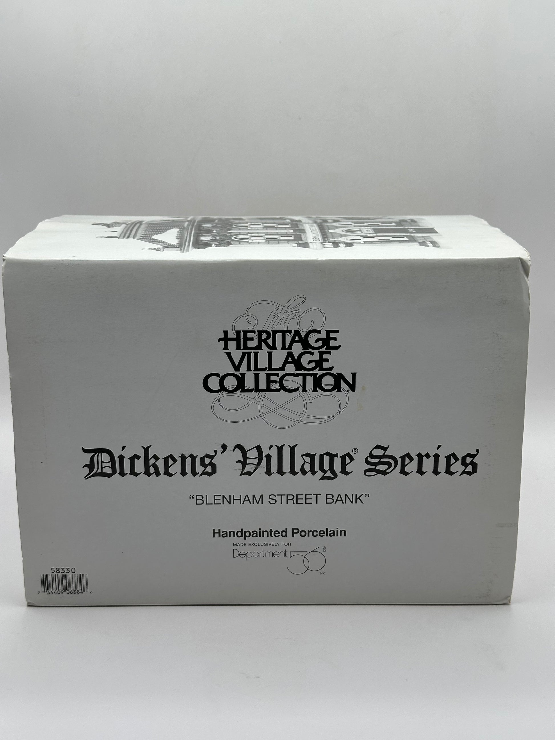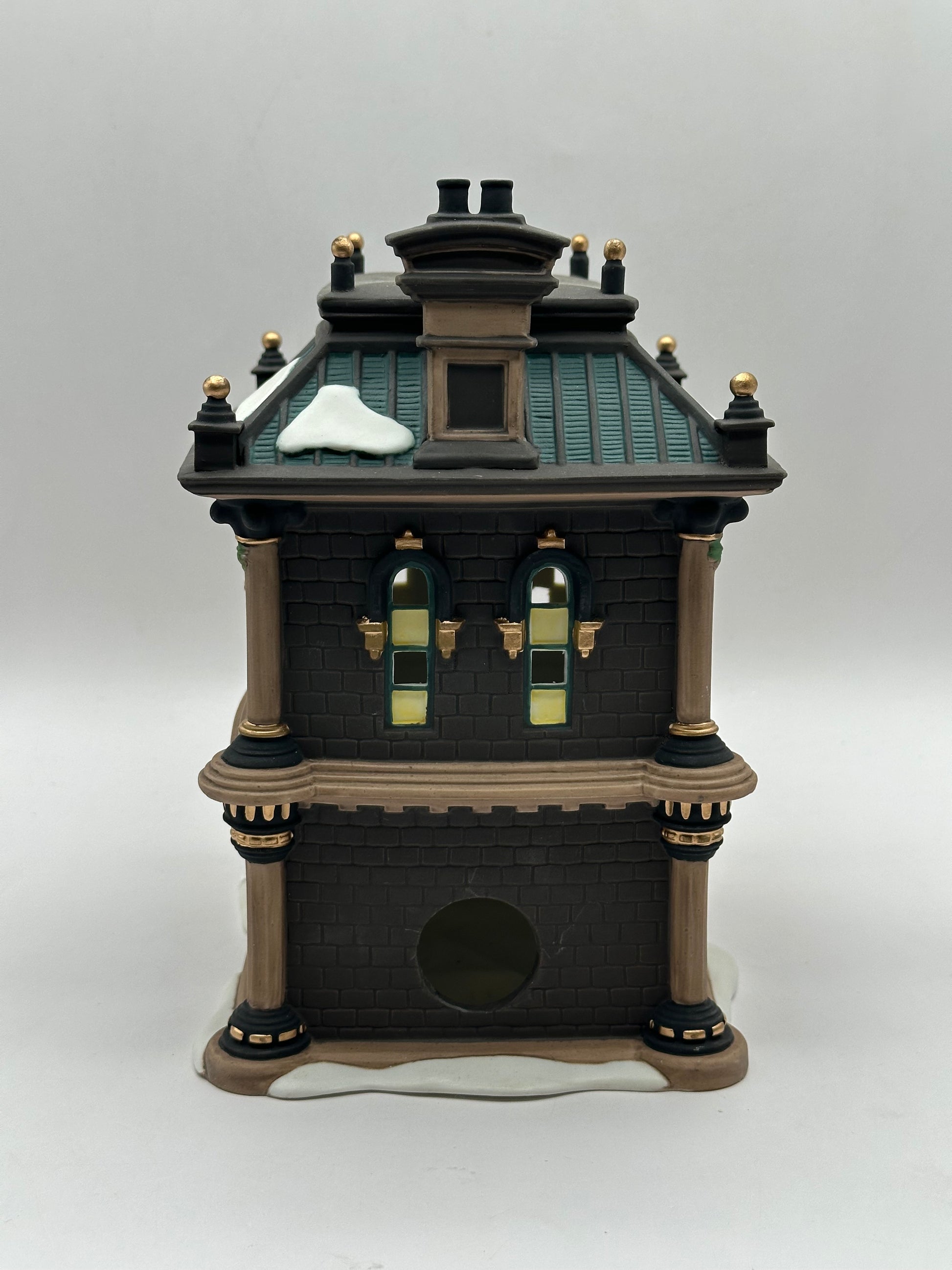 Blenham Street Bank stands as a pillar of trust and prosperity in Dickens Village, a distinguished stone building you’d find along one of the town’s more prominent thoroughfares. Its stately façade, trimmed with classic Victorian detailing and lightly dusted with snow, reflects the steady business of clerks, merchants, and townsfolk tending to their affairs. Warm window light hints at ledgers, coin trays, and the quiet hum of daily commerce inside.