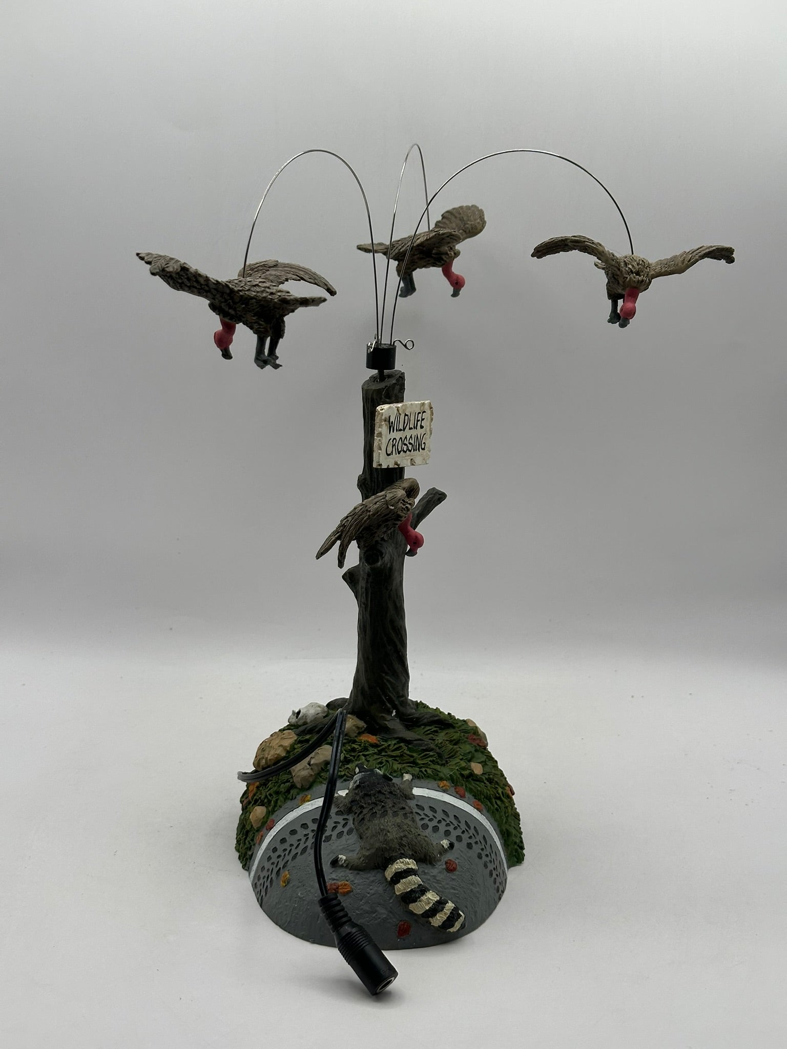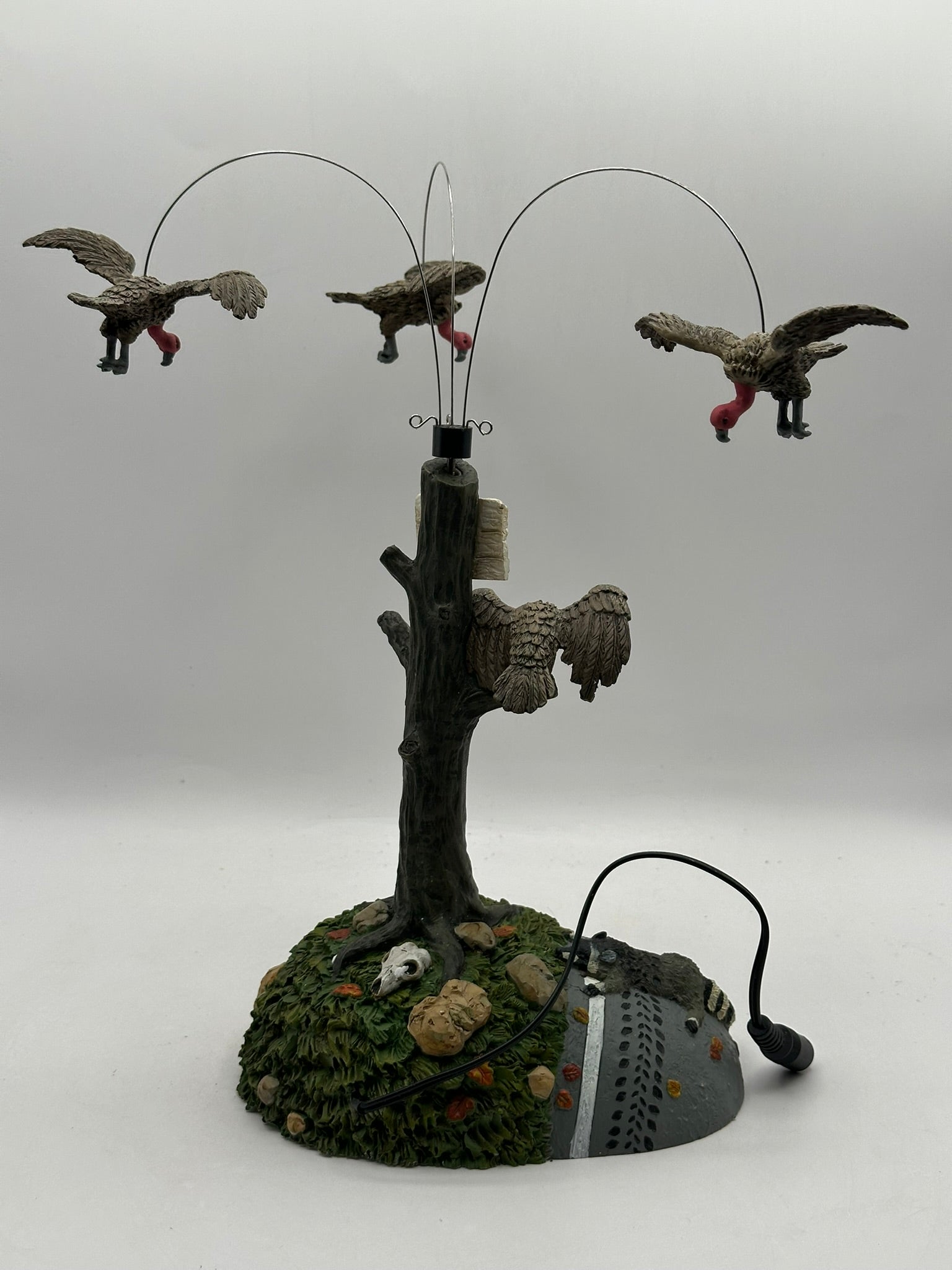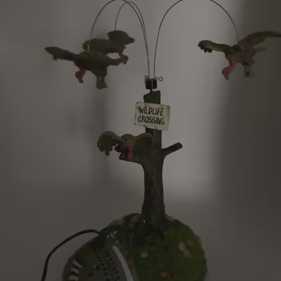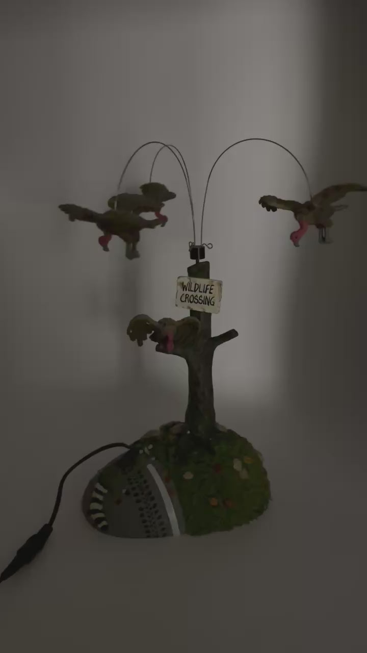 Add a dash of dark humour to your Halloween Village with Buzzard Delight! This quirky accessory depicts a hapless raccoon sprawled at the base of a wooden signpost, surrounded by a flock of buzzards. With an included battery-powered motor, the buzzards rotate eerily overhead; an amusing nod to "nature’s cleanup crew."