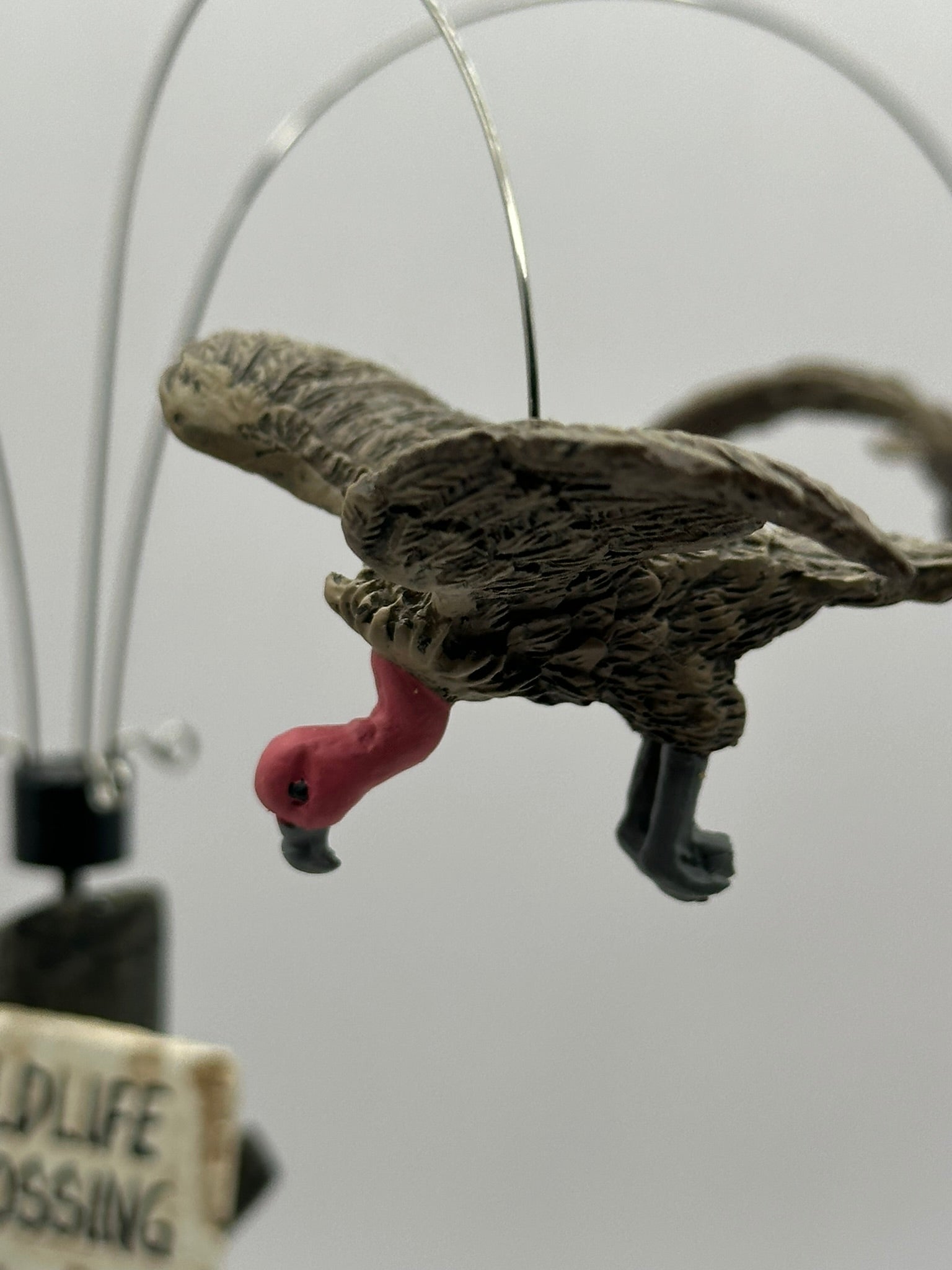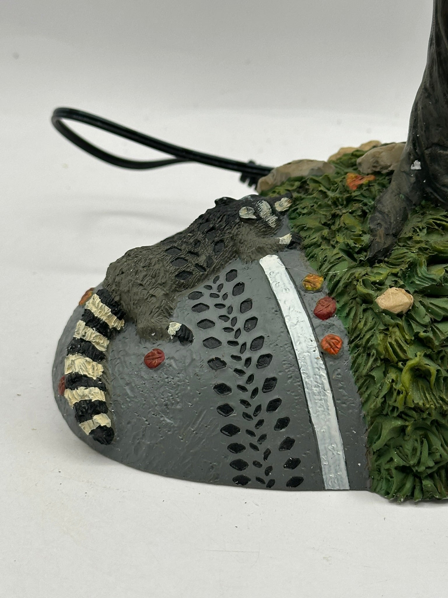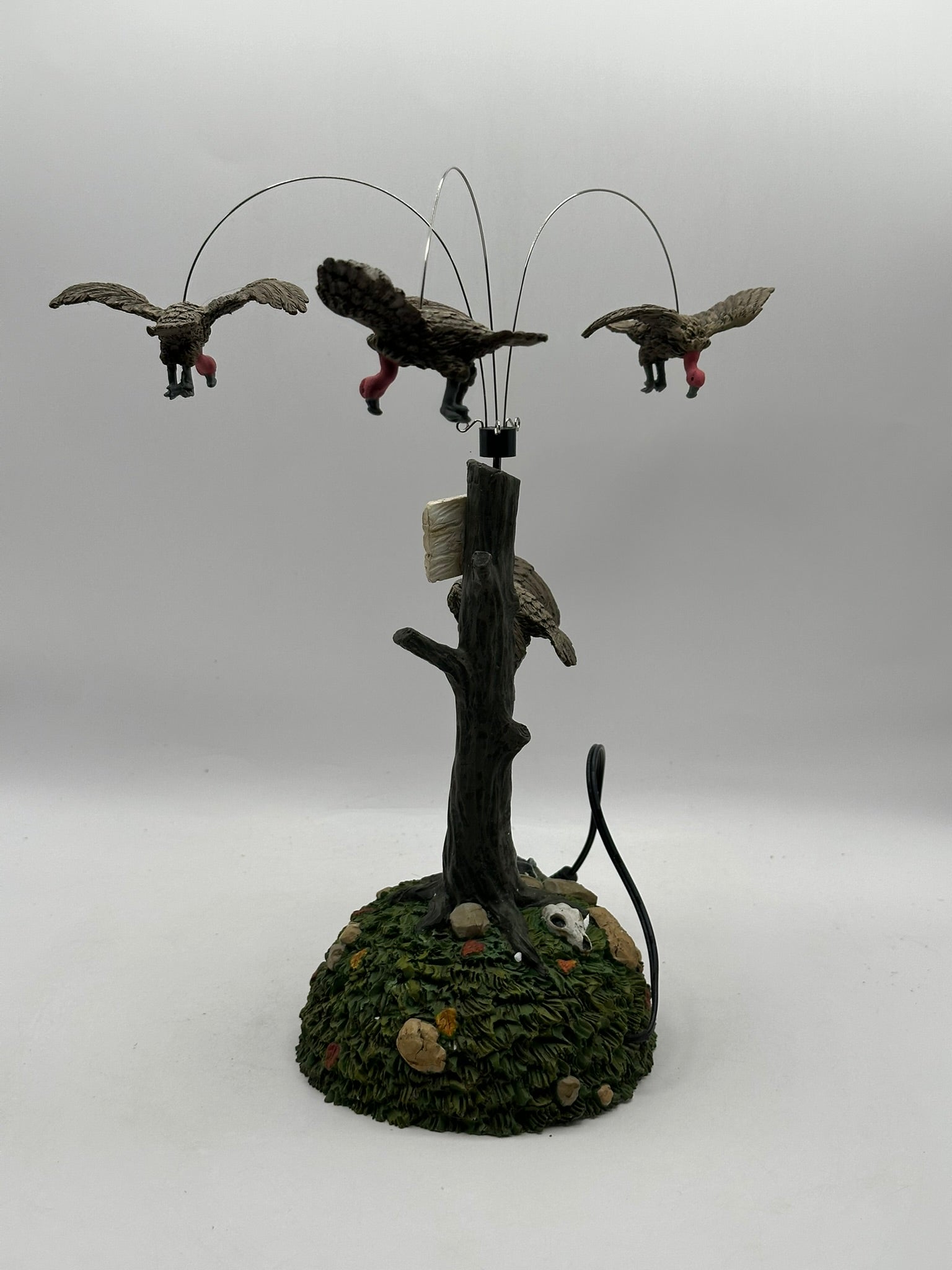 Add a dash of dark humour to your Halloween Village with Buzzard Delight! This quirky accessory depicts a hapless raccoon sprawled at the base of a wooden signpost, surrounded by a flock of buzzards. With an included battery-powered motor, the buzzards rotate eerily overhead; an amusing nod to "nature’s cleanup crew."