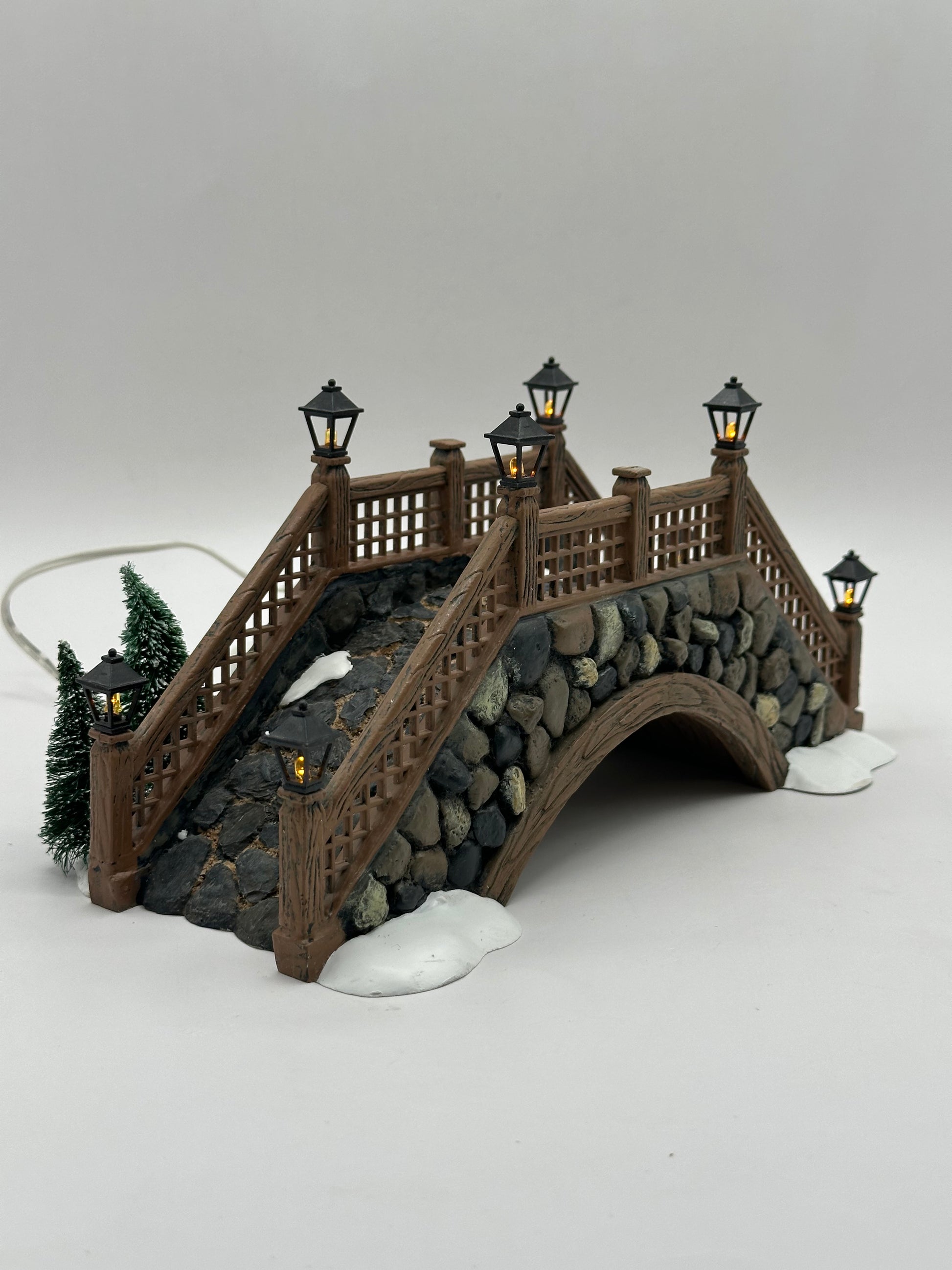 This quaint footbridge features the look of hand-laid fieldstone, forming a sturdy little arch perfect for spanning a narrow creek or snowy pathway. The stones vary in shape and size, giving the piece a natural, old-world charm that feels right at home in a rural village setting. Light touches of snow gather along the top and base, suggesting a crisp winter day.