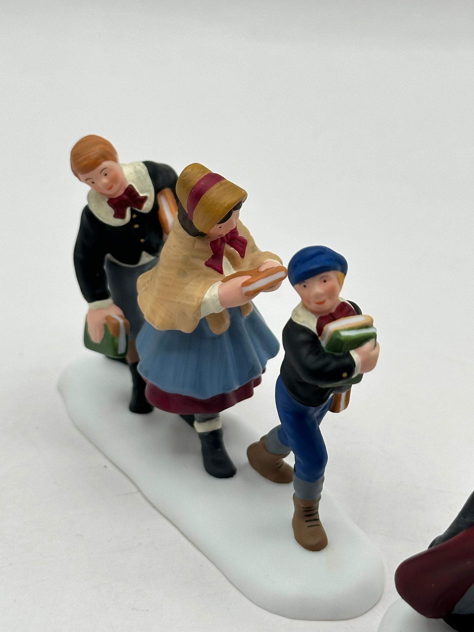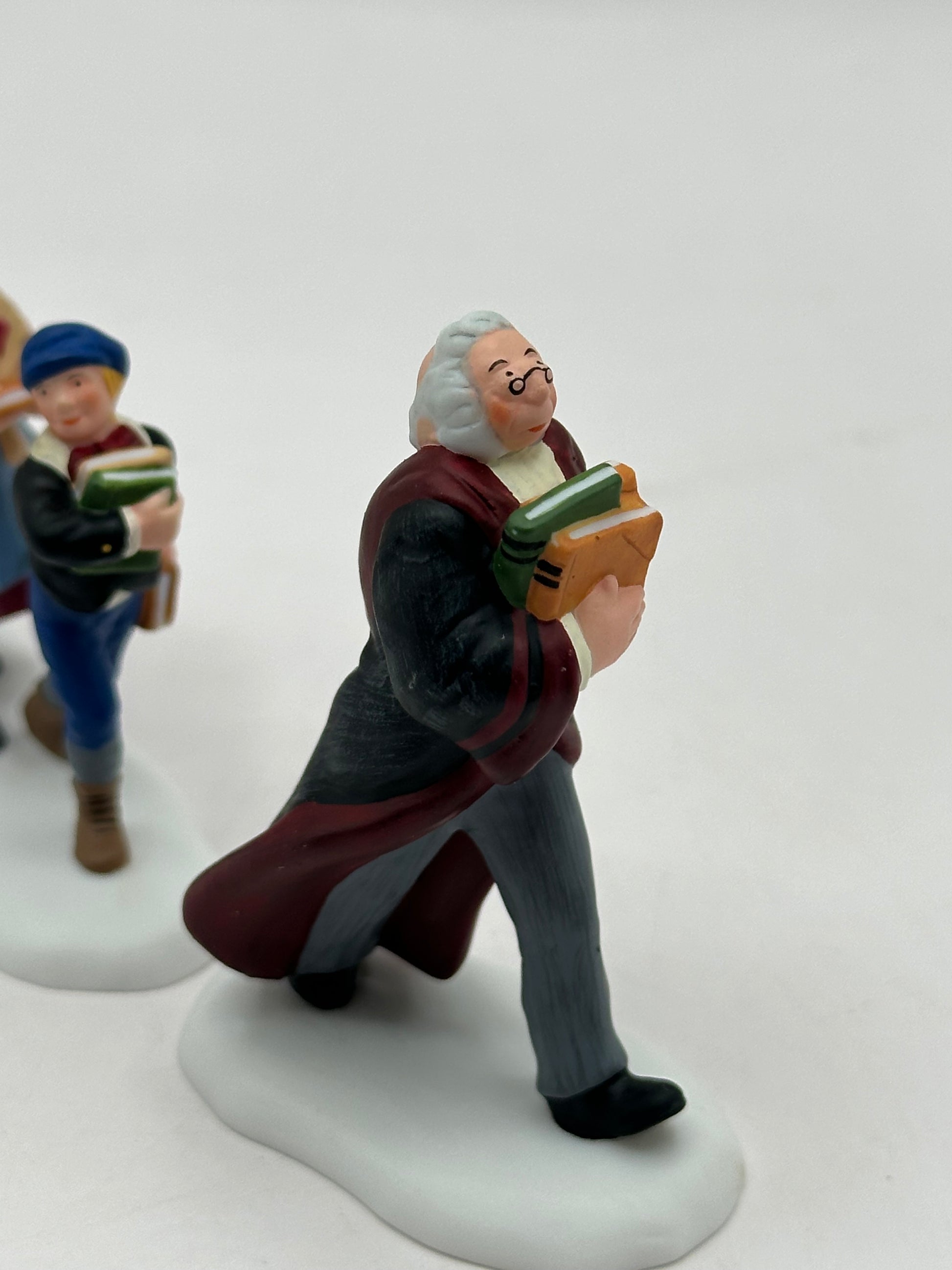 In Following the Leader, a group of eager children trails behind a learned professor, each clutching their books as they make their way through the village. This charming scene captures the curiosity and excitement of learning in a Dickensian setting.