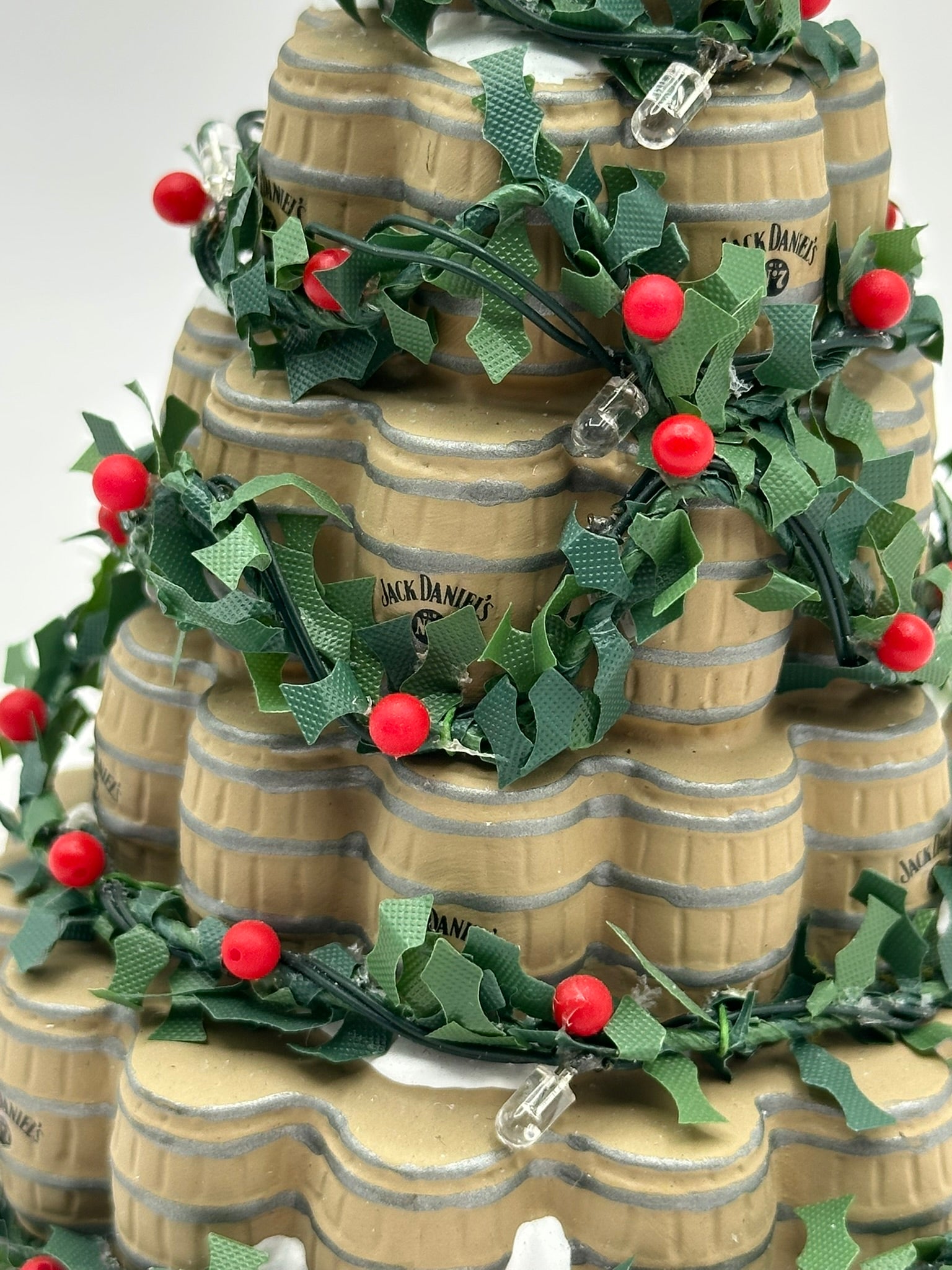 Inspired by the iconic holiday display at the Jack Daniel’s Distillery, this intricately detailed collectible features stacked miniature barrels adorned with festive lights and the classic Jack Daniel’s logo. A must-have for whiskey lovers and collectors alike, it adds a unique and rustic charm to your holiday décor.