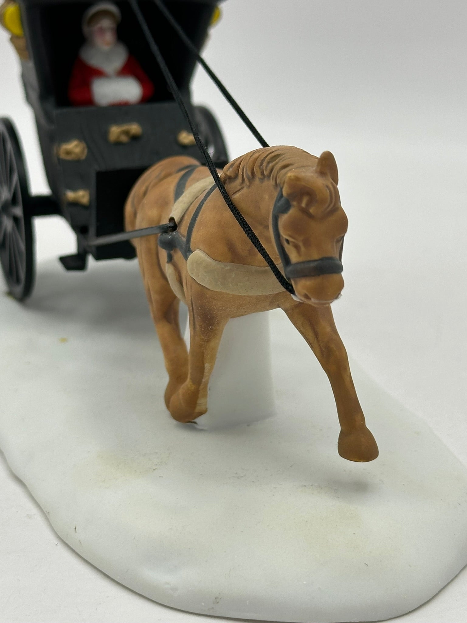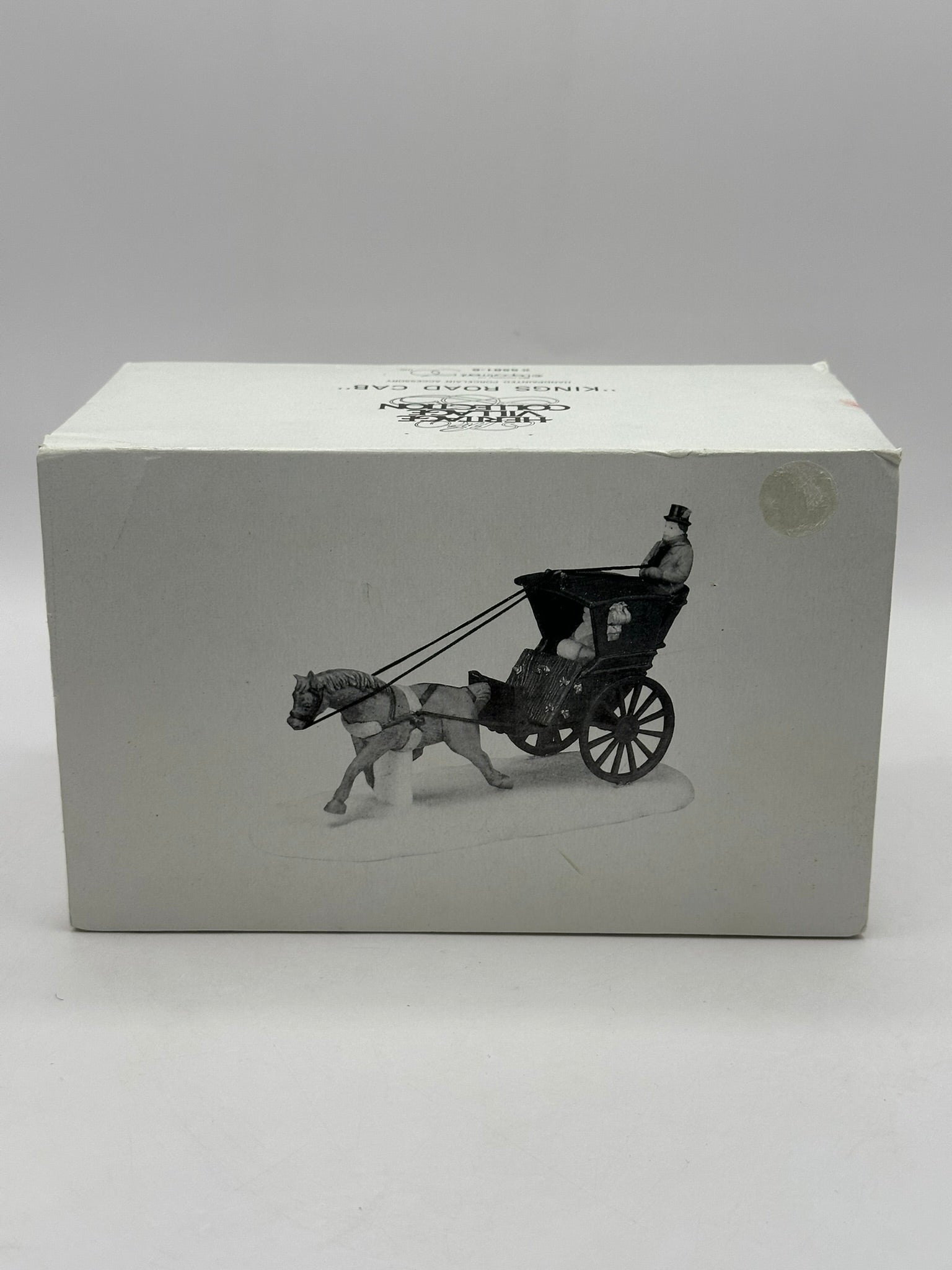Bring a touch of 19th-century London charm to your display with the King’s Road Cab accessory from Department 56’s Dickens’ Village collection. This elegant horse-drawn carriage features a well-dressed cabbie at the reins and a bundled-up passenger enjoying the snowy ride. With intricate details and classic Victorian style, this piece adds movement and storytelling to your village streetscape. A timeless addition to any Dickensian scene.
