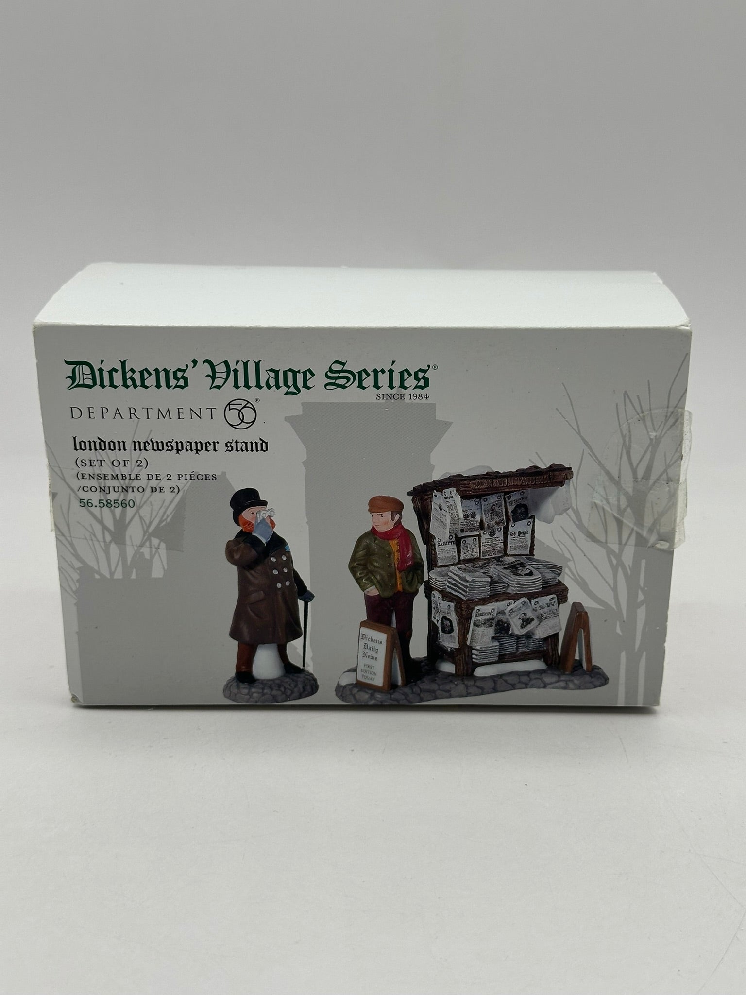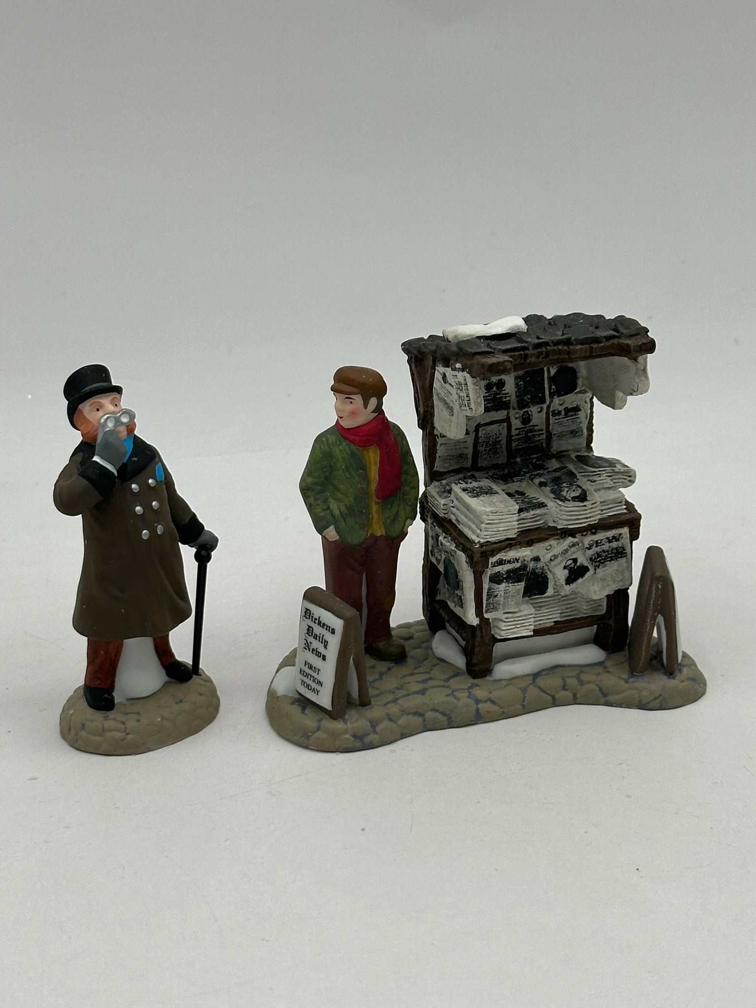 Capture the charm of Victorian London with this delightful two-piece set from the Dickens’ Village Series. Featuring a bustling newspaper stand stacked with the latest headlines and a well-dressed gentleman catching up on the day's news, this piece brings the lively street life of old London to your holiday display.