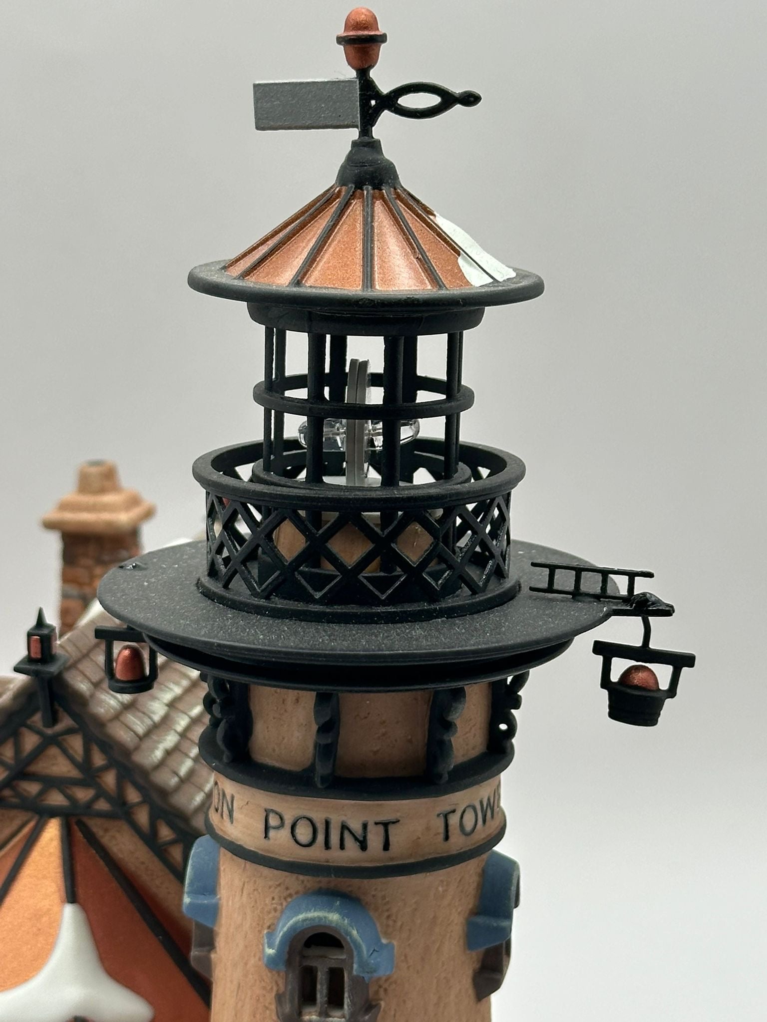 Standing proudly along the misty shoreline of Dickens’ Village, Lynton Point Tower guides sailors safely through fog and storm. Its steady light serves as a beacon of hope for ships returning home to London’s bustling port, a symbol of vigilance and warmth against the dark winter sea.