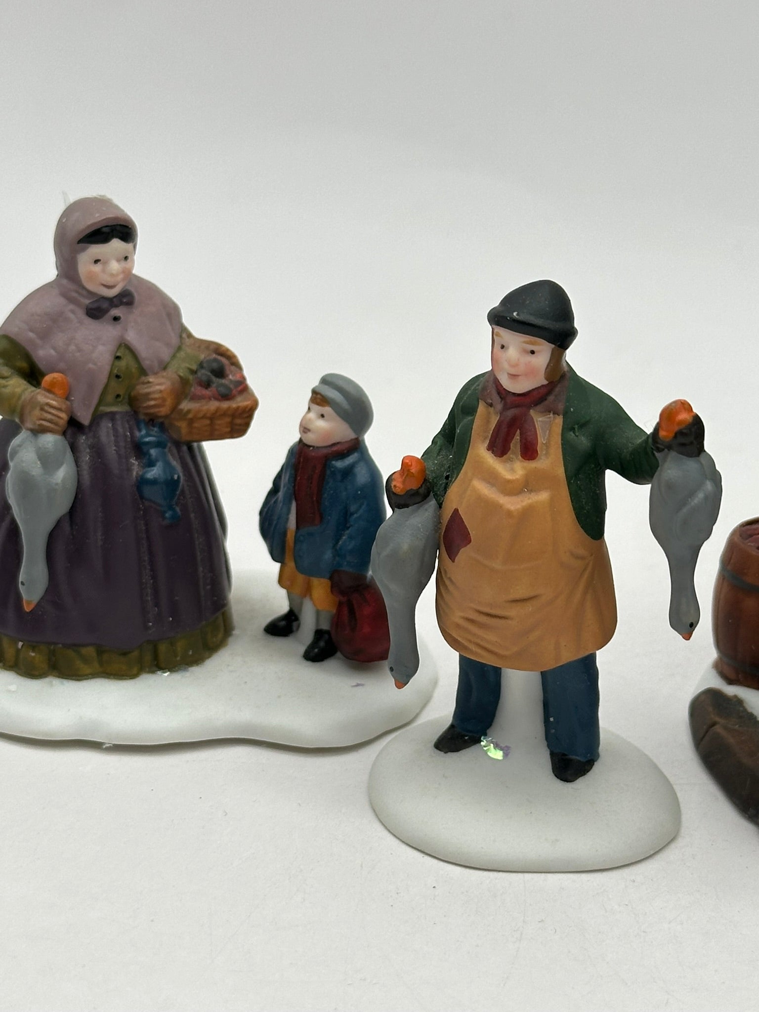 Poultry Market brings the hustle and bustle of an old-fashioned village marketplace to life. This hand-painted porcelain trio features a detailed market stall brimming with poultry, a friendly vendor ready to assist, and charming village shoppers selecting their goods.