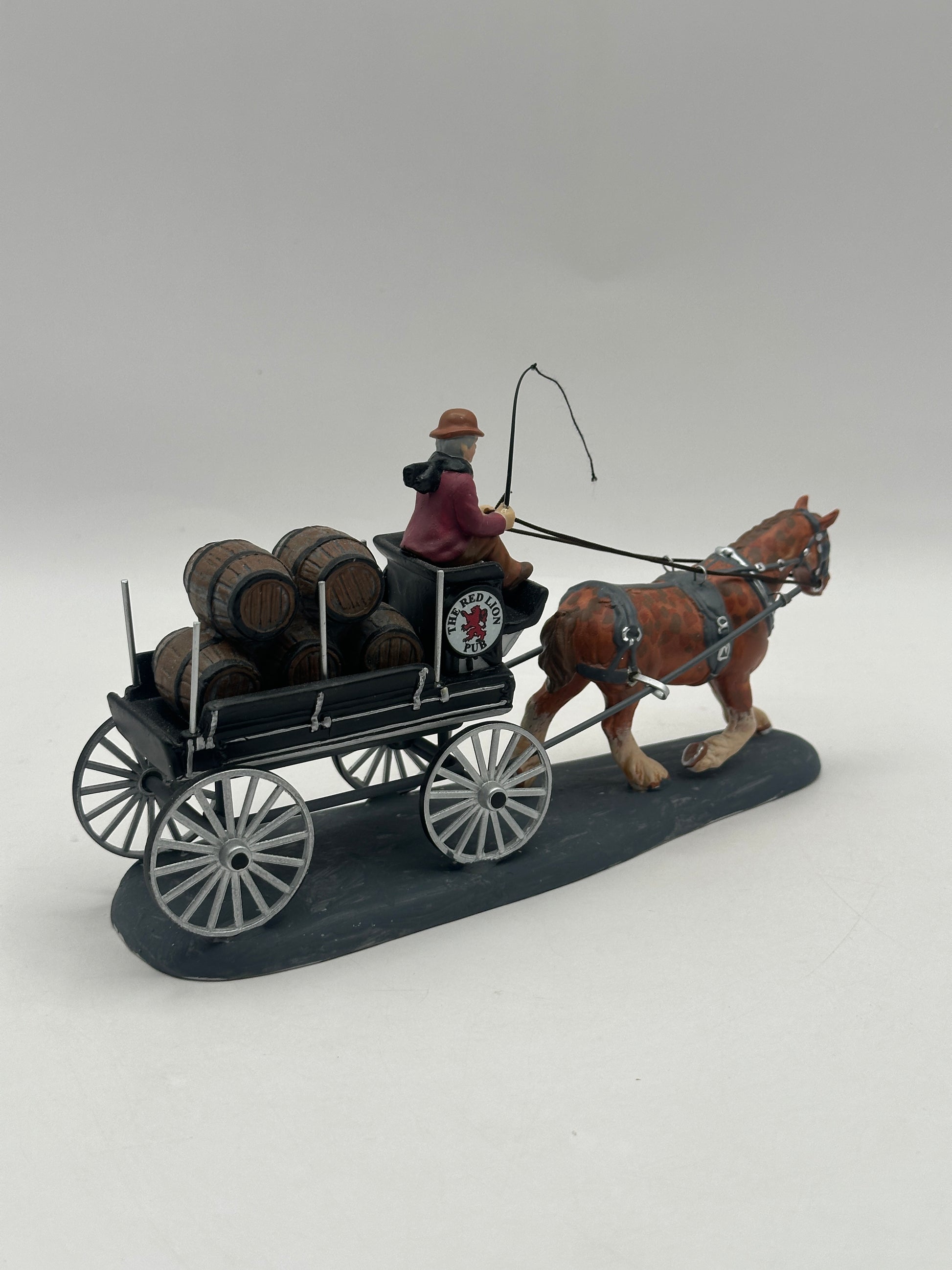 Part of the Dickens’ Village Series, this detailed accessory features a horse-drawn wagon delivering barrels of ale from the Red Lion Pub. With its classic logo, wooden casks, and period attire, it adds movement and charm to any village street scene. A must-have for collectors who love the everyday hustle of Victorian life.