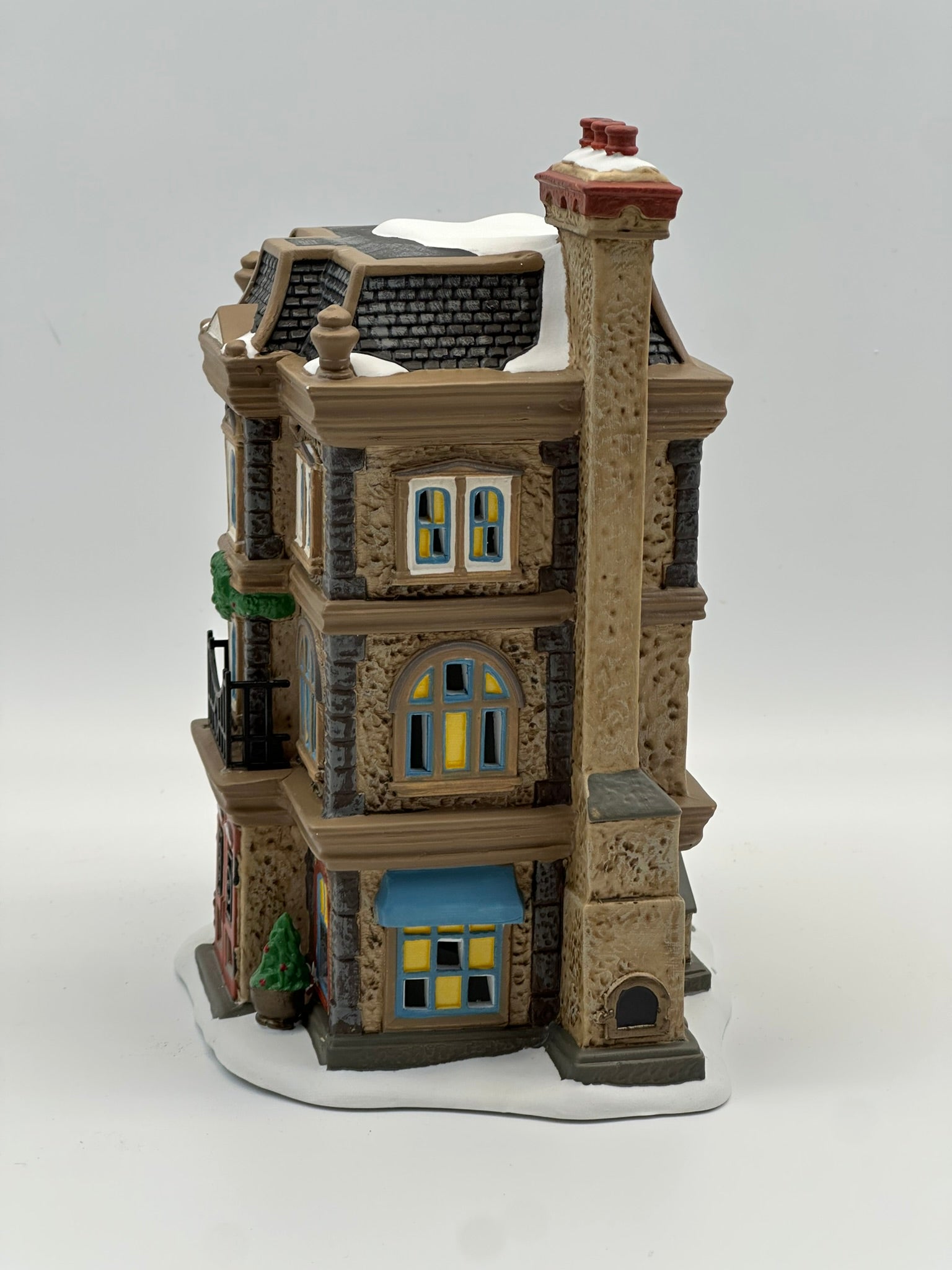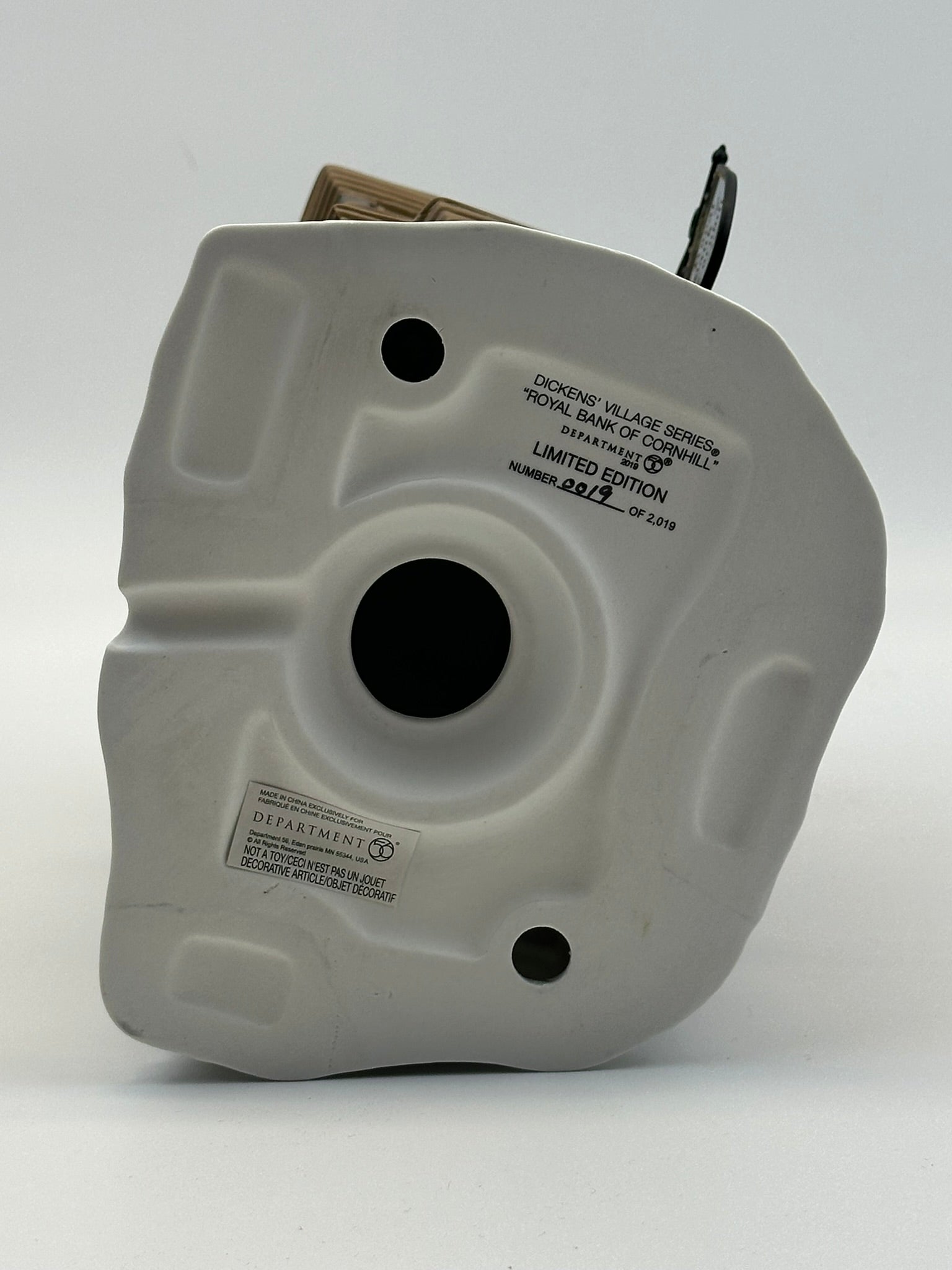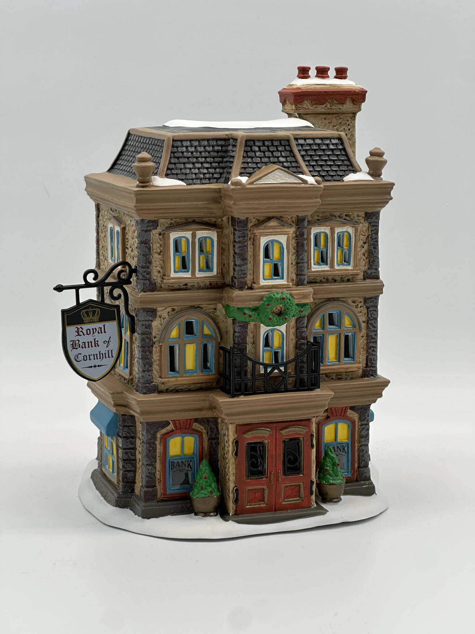 As the financial center of London and, by extension, all of England, Cornhill is a district full of banks such as this one. The regal design of the building seeks to strike customers' eyes and draw them away from rivals. With grand arched windows, festive wreaths, and a stately façade, this limited-edition piece captures the elegance and prestige of Victorian banking. A 2019 release from the Dickens’ Village Series.