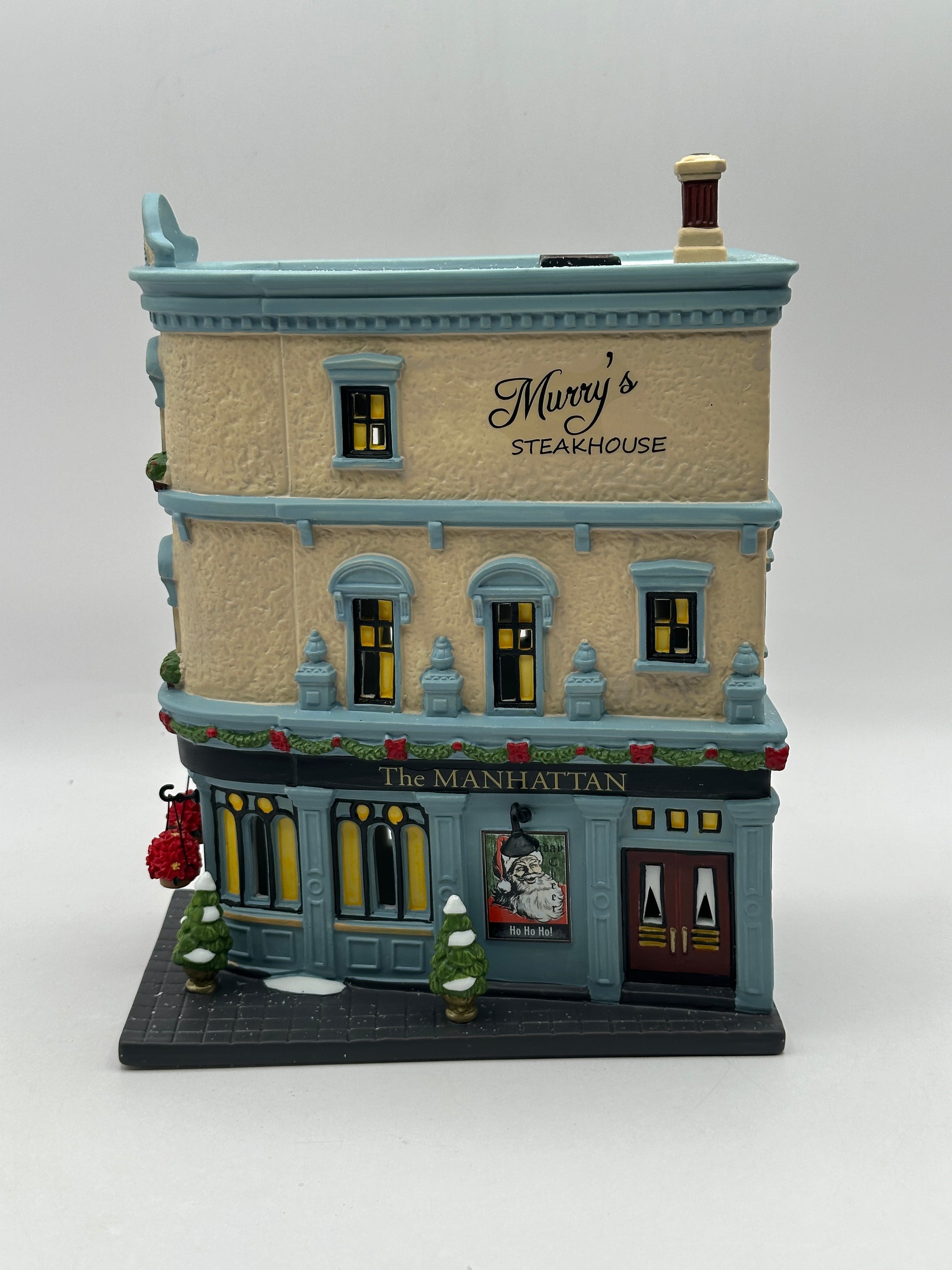 Elegant and inviting, The Manhattan from Department 56’s Christmas in the City collection captures the charm of a classic urban steakhouse and bar. With hanging red flower baskets, snow-dusted evergreens, and a vintage sign welcoming patrons, this stylish corner building suggests a favorite local haunt for well-dressed regulars and out-of-town guests alike. You can almost imagine the clink of glasses and soft jazz playing inside as business professionals unwind after a long day, or old friends gather for cocktails and a perfectly cooked steak. With “Murry’s Steakhouse” scripted above and festive garlands accenting the trim, this piece adds a touch of city sophistication to your village scene.