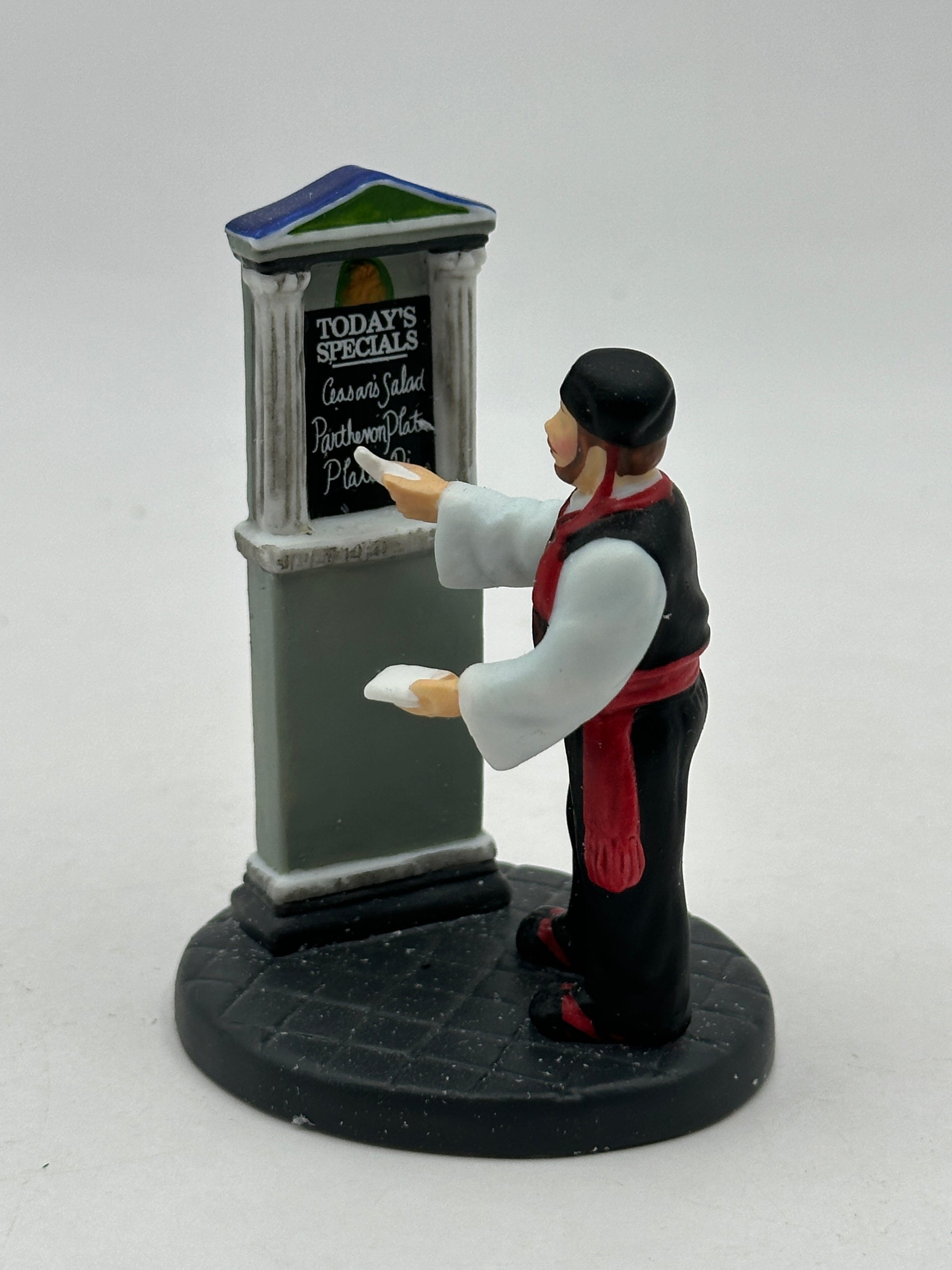 This delightful figurine features a friendly sidewalk vendor chalking up the daily menu, capturing the hustle and warmth of a city street during the festive season. With its vintage flair, it’s the perfect accent to bring life and personality to your city scene.
