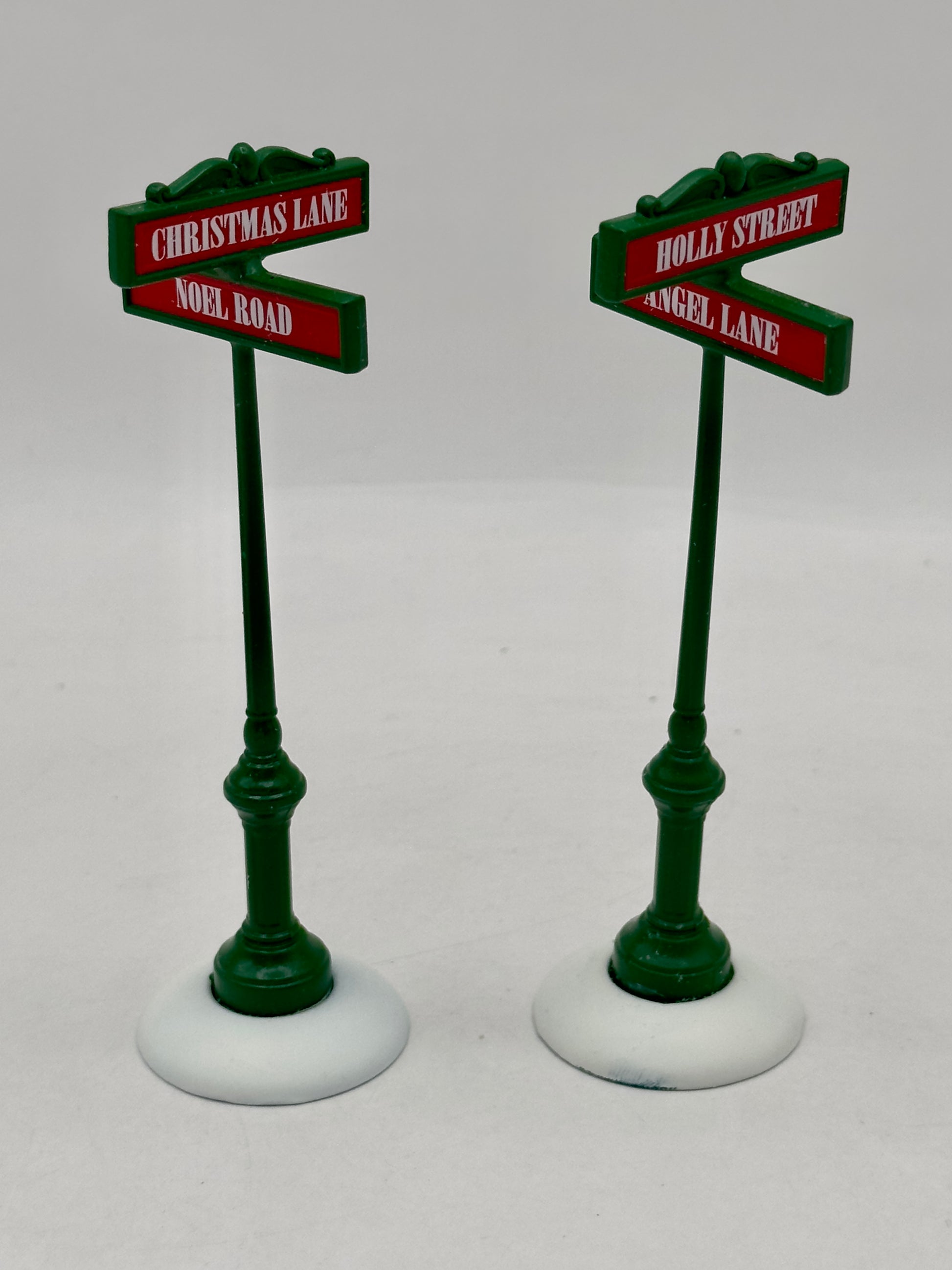 Guide your villagers with festive charm using these Department 56 Village Street Signs. Featuring names like Christmas Lane, Noel Road, Holly Street, and Angel Lane, these classic green posts with red and white signs add a touch of realism to any holiday village scene.