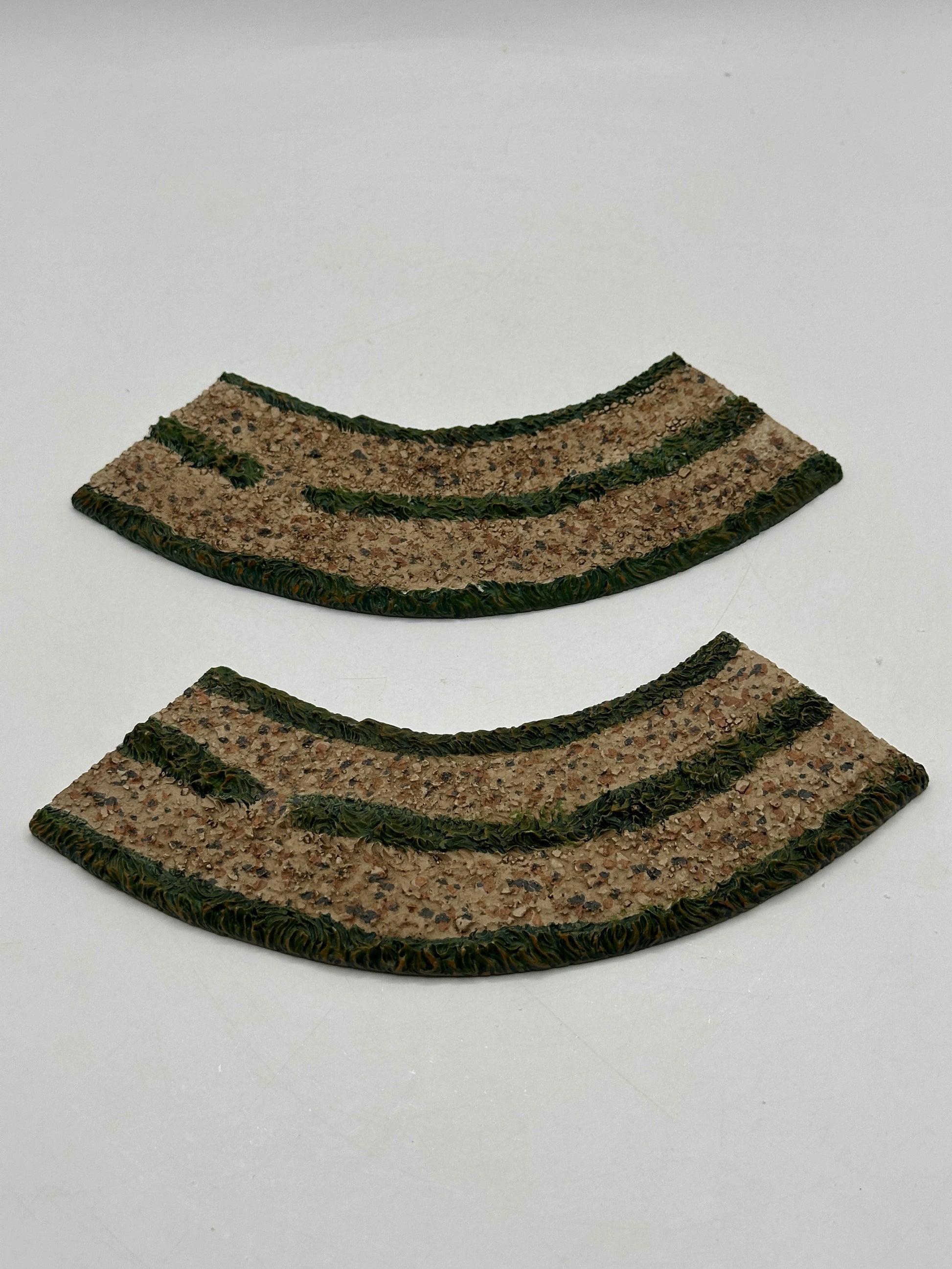 A natural-looking curved road set of two pieces with painted stone and dirt textures, ideal for crafting twists and turns in a rustic woodland village scene. Designed to seamlessly join with straight road sections, this accessory enhances realism and depth in countryside-themed displays. Perfect for creating winding pathways through cottage clusters, creeks, or forest clearings.