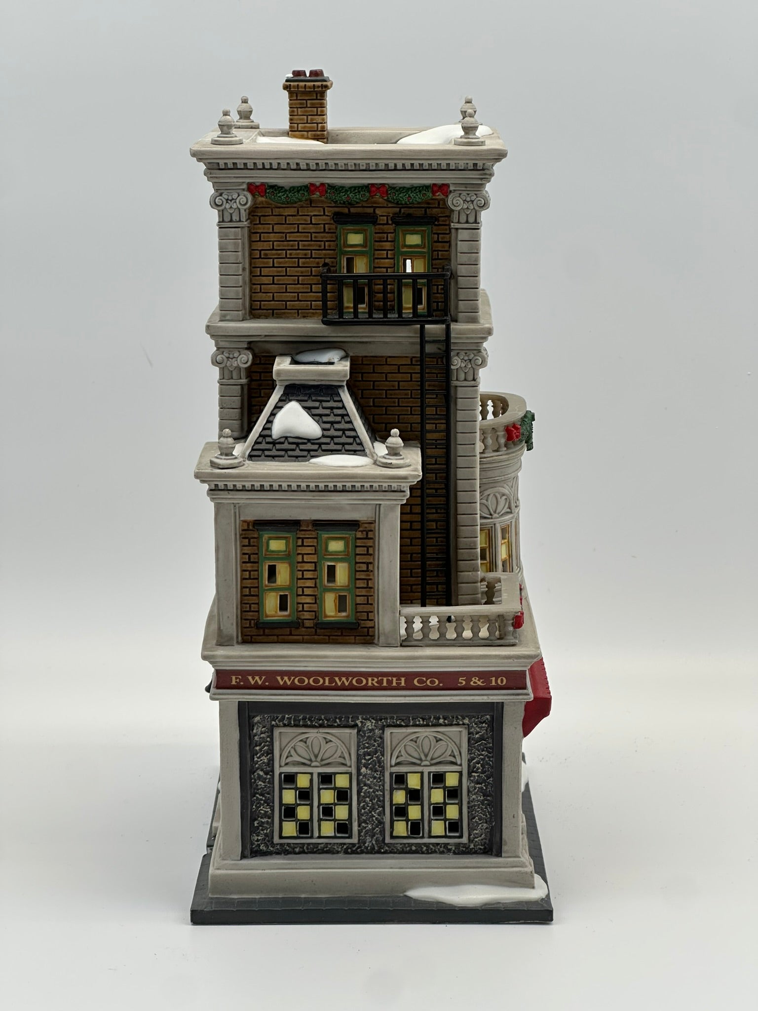 Step back in time with this detailed replica of one of America’s most iconic retail landmarks. Woolworth’s, the original five-and-dime store, comes alive in this festive Department 56 piece, featuring classic architectural details, holiday wreaths, and a charming peek into the store’s vintage lunch counter window.
