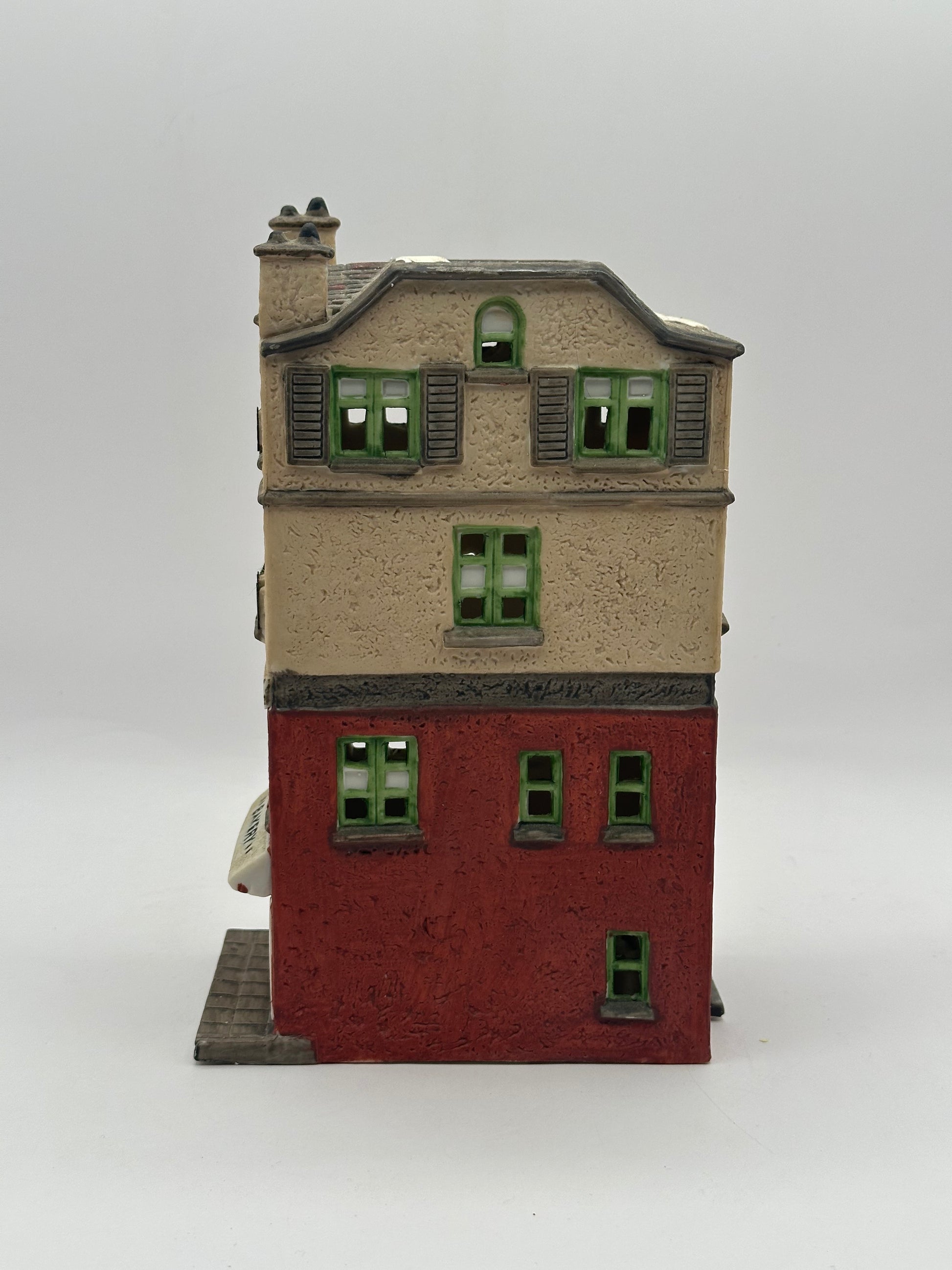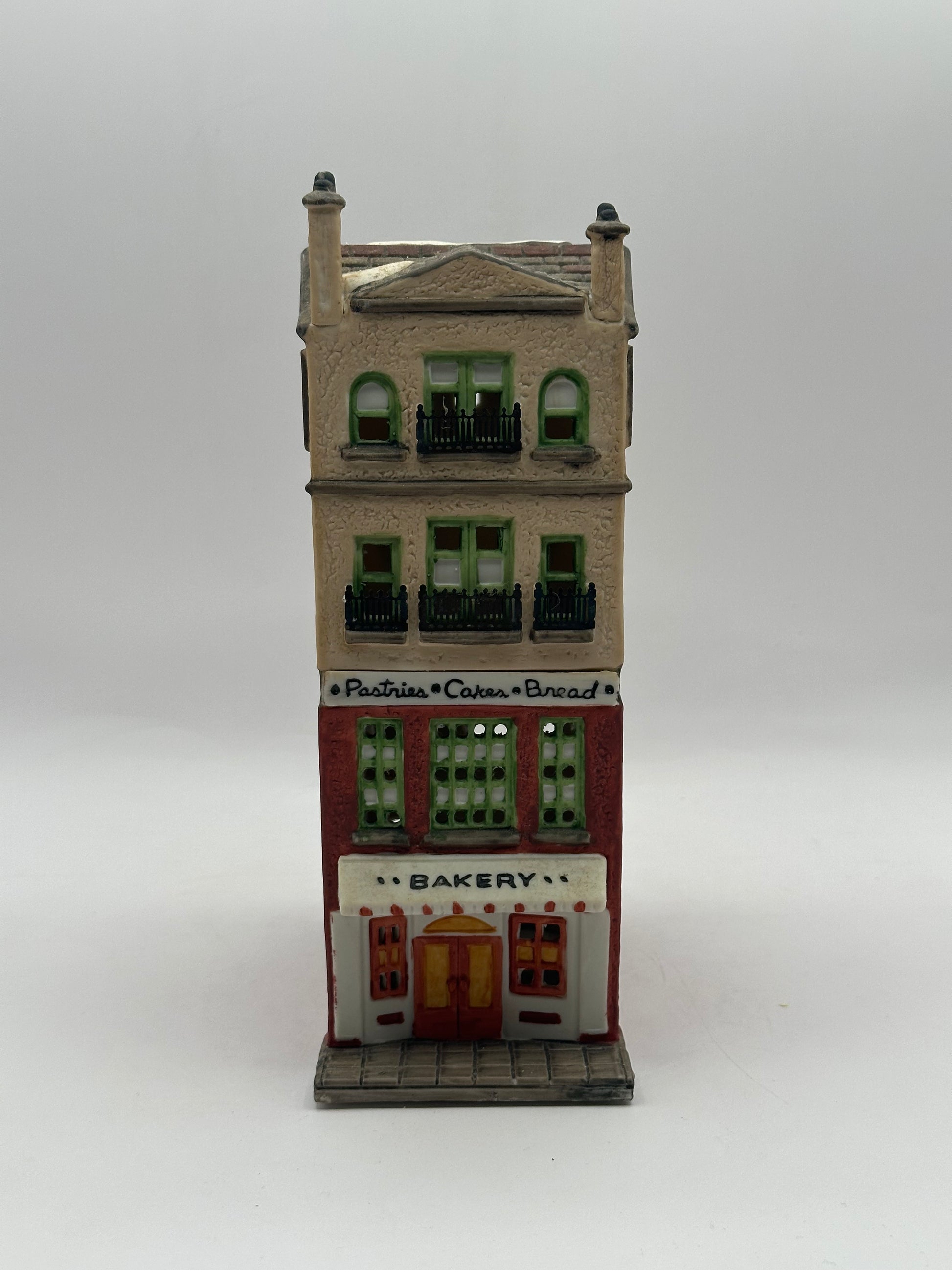 A delightful neighborhood bakery offering fresh pastries, cakes, and bread, complete with charming green trim and cozy holiday details—an essential piece for any Christmas in the City village!