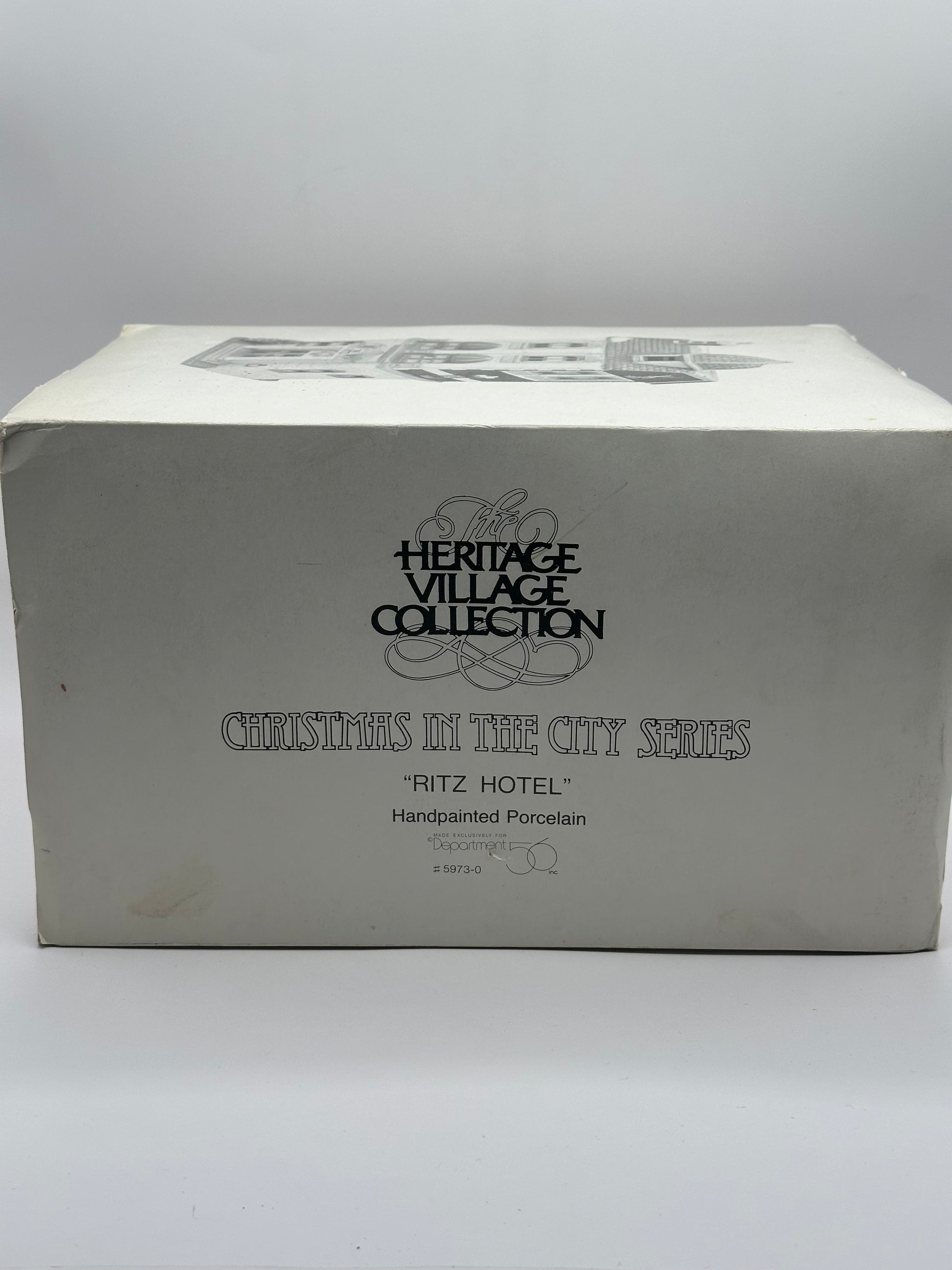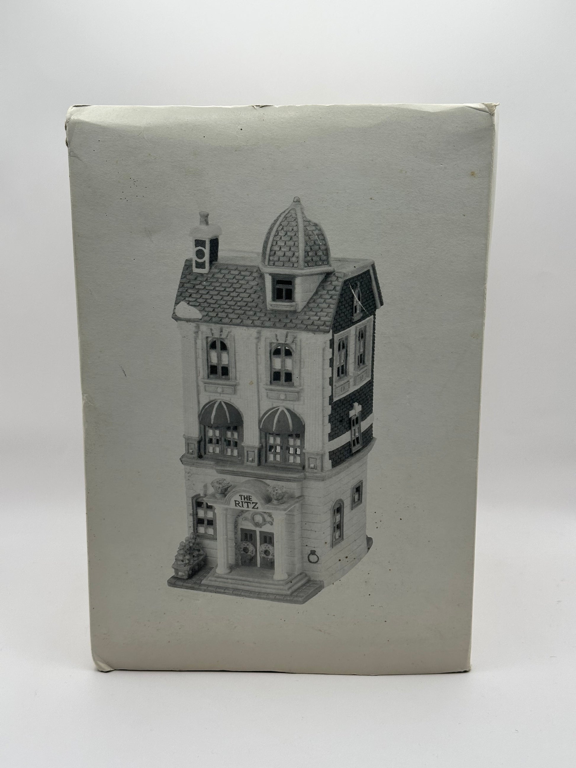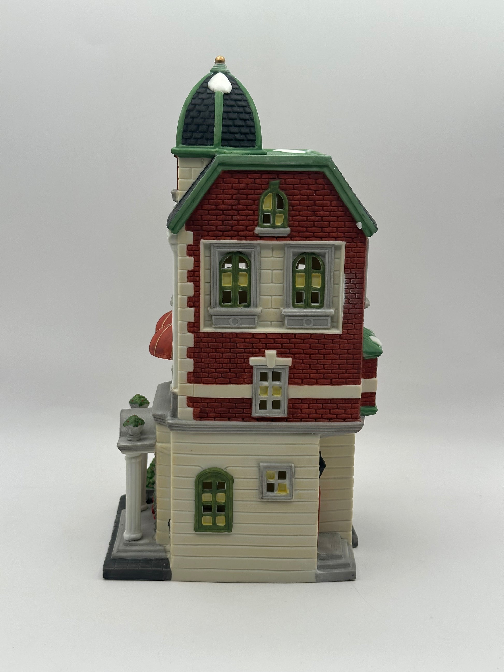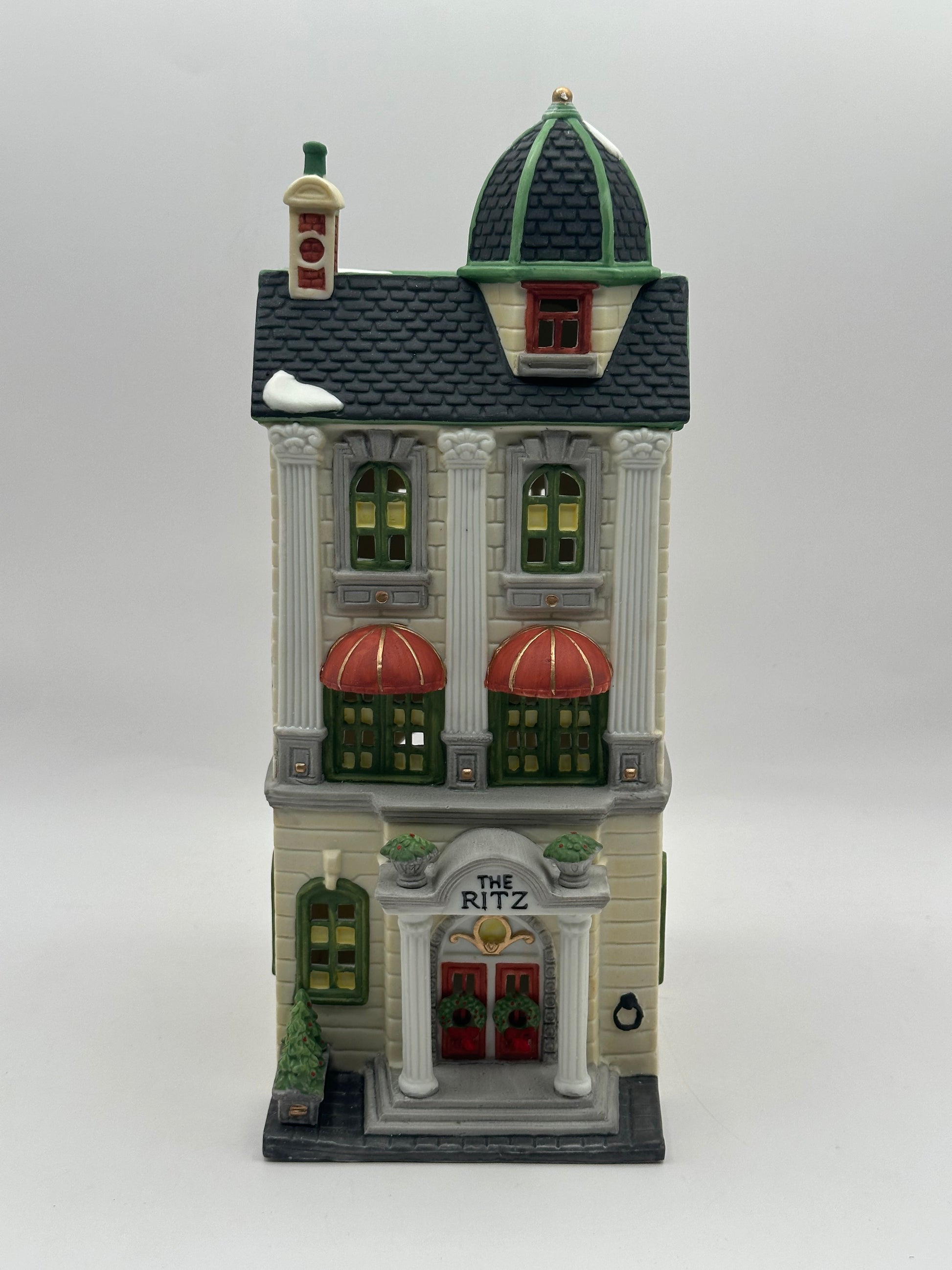 An elegant, European-style hotel with red awnings, festive wreaths, and classic architecture. A sophisticated addition to your Christmas in the City village scene!