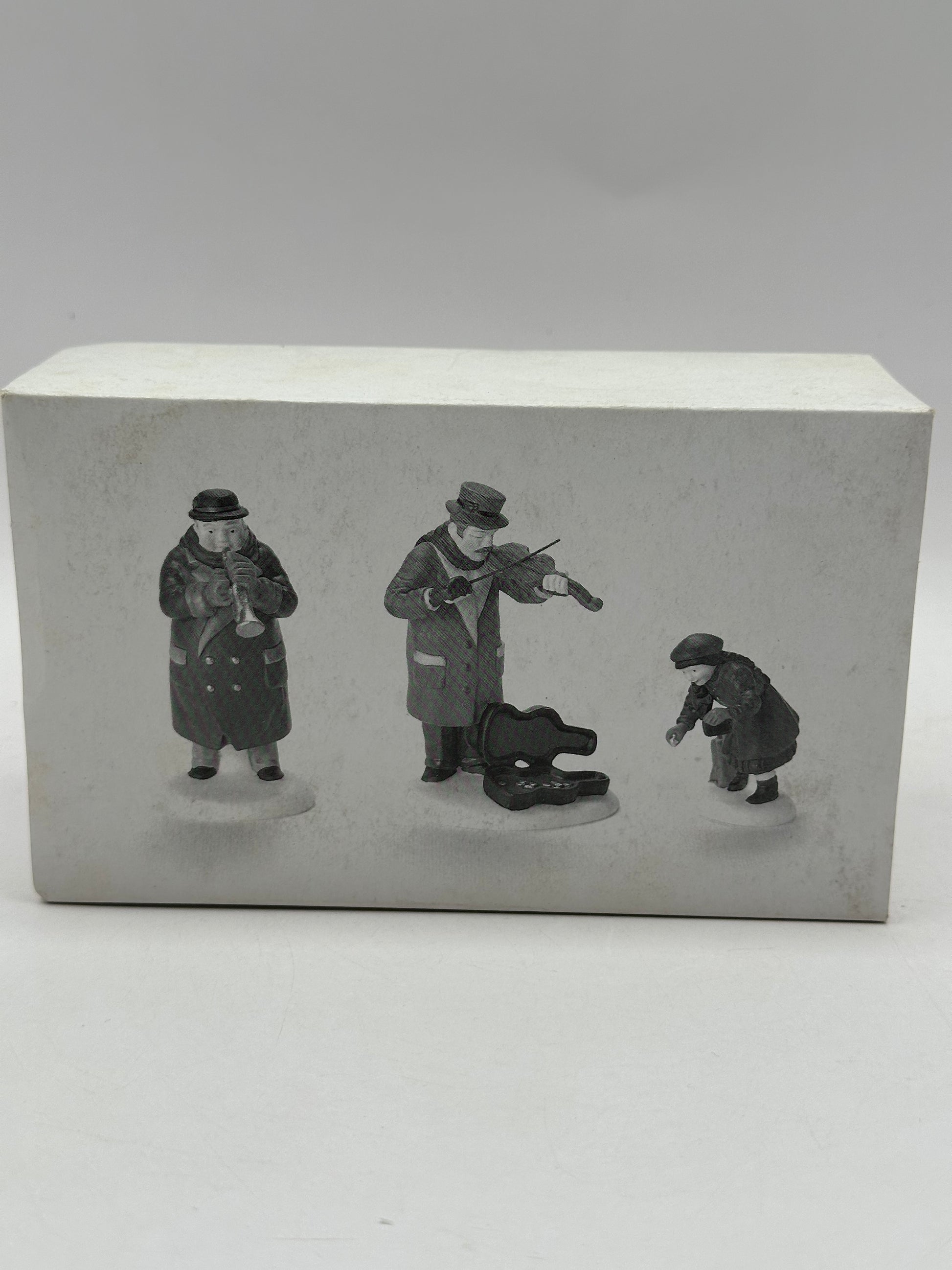 Bring the sounds of the season to your village with this charming trio of street performers. Featuring a trumpet player, a violinist, and a young girl dropping coins into an open case, this set captures the warmth and spirit of holiday busking. A wonderful way to add life and festive cheer to your Christmas in the City display!