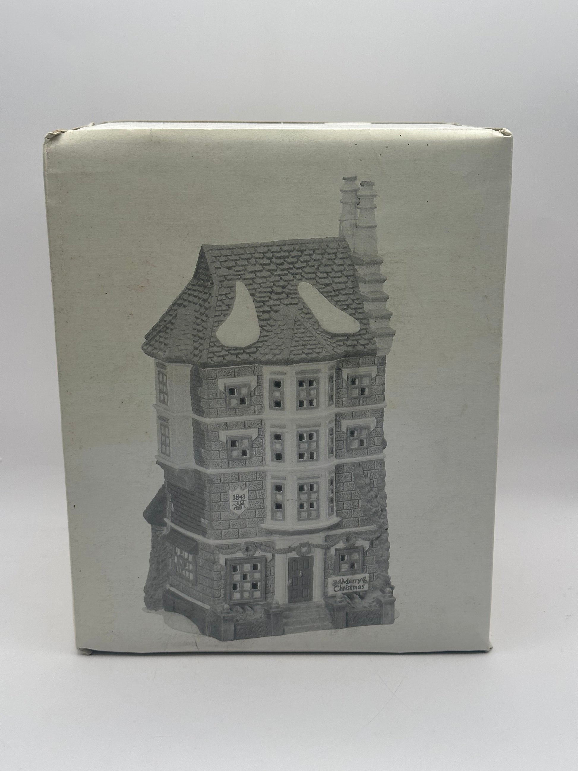 With snow resting gently on the roof and the year 1843 marked on the building’s plaque, this piece celebrates the publication year of Dickens' beloved story. A small sign reading “Merry Christmas” adds just the right holiday sentiment.
