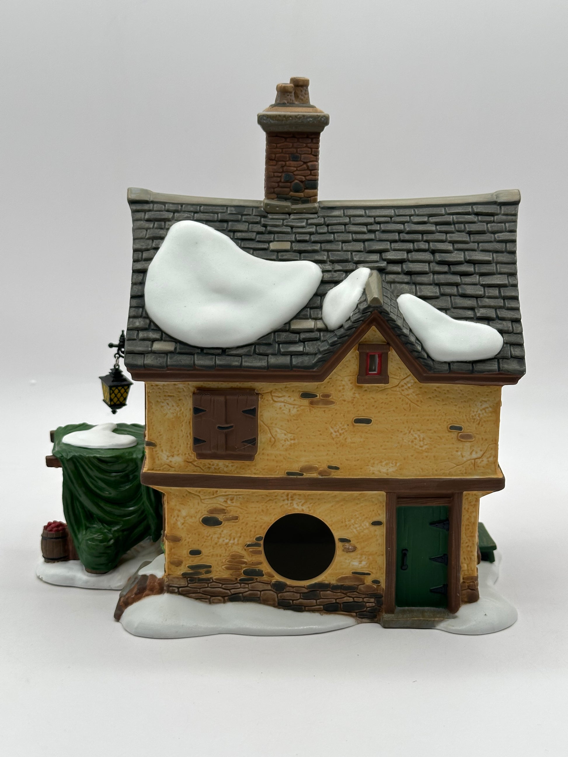 Fill your village with the scent of the season at Seton Morris Spice Merchant. This festive shop features warm stone walls, snow-topped dormers, and bright red wreaths at the windows. Outside, baskets overflow with apples and goods, bringing the bustle of a holiday market to life. A charming and flavorful addition to your Dickens Village display.
