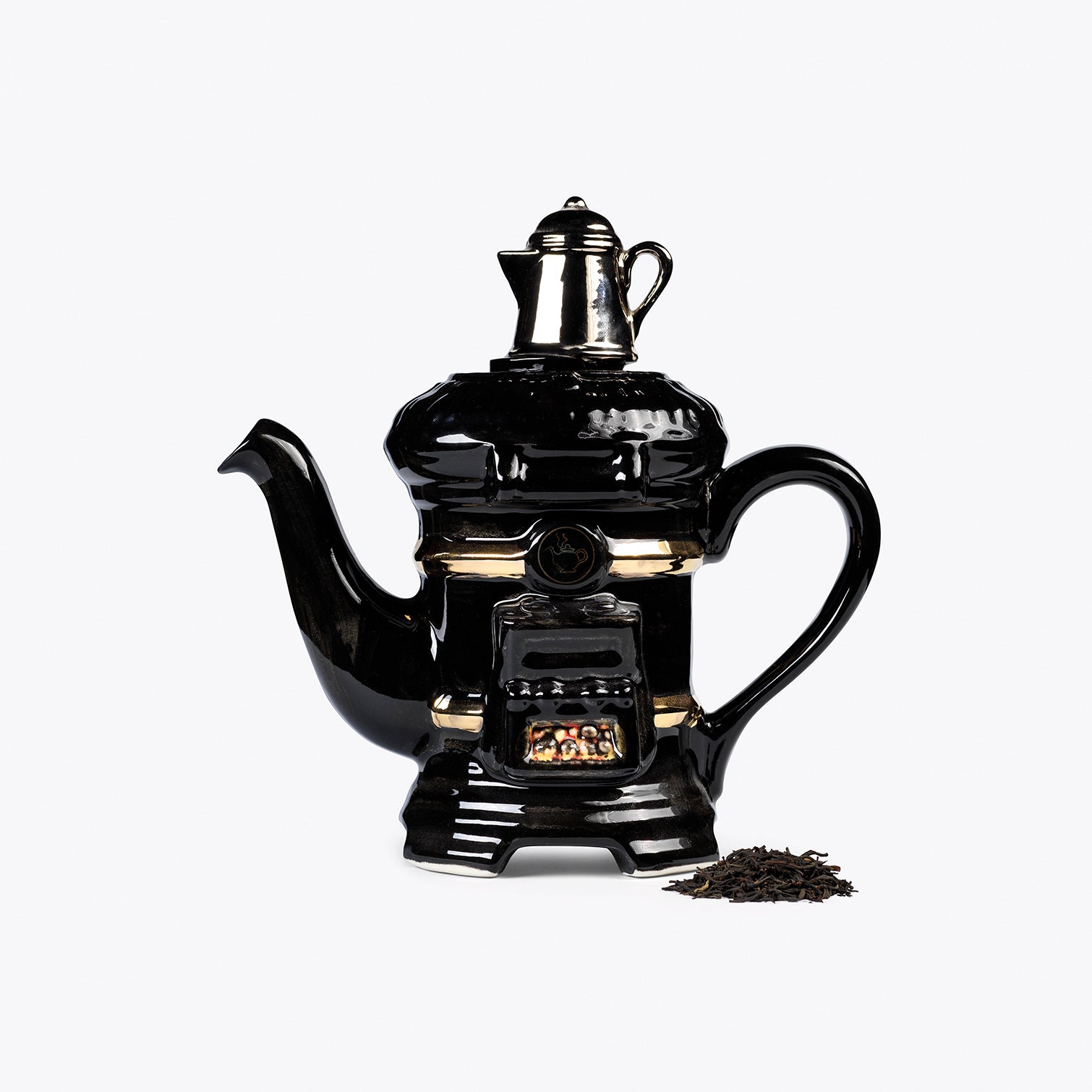 Inspired by the cozy charm of vintage cast-iron stoves, the Pot Belly Stove teapot by Carters of Suffolk adds warmth and character to any teatime. Handmade and hand-painted in England, this teapot is shaped like a classic black stove, complete with gold detailing, a faux flame window, and a miniature kettle on top.