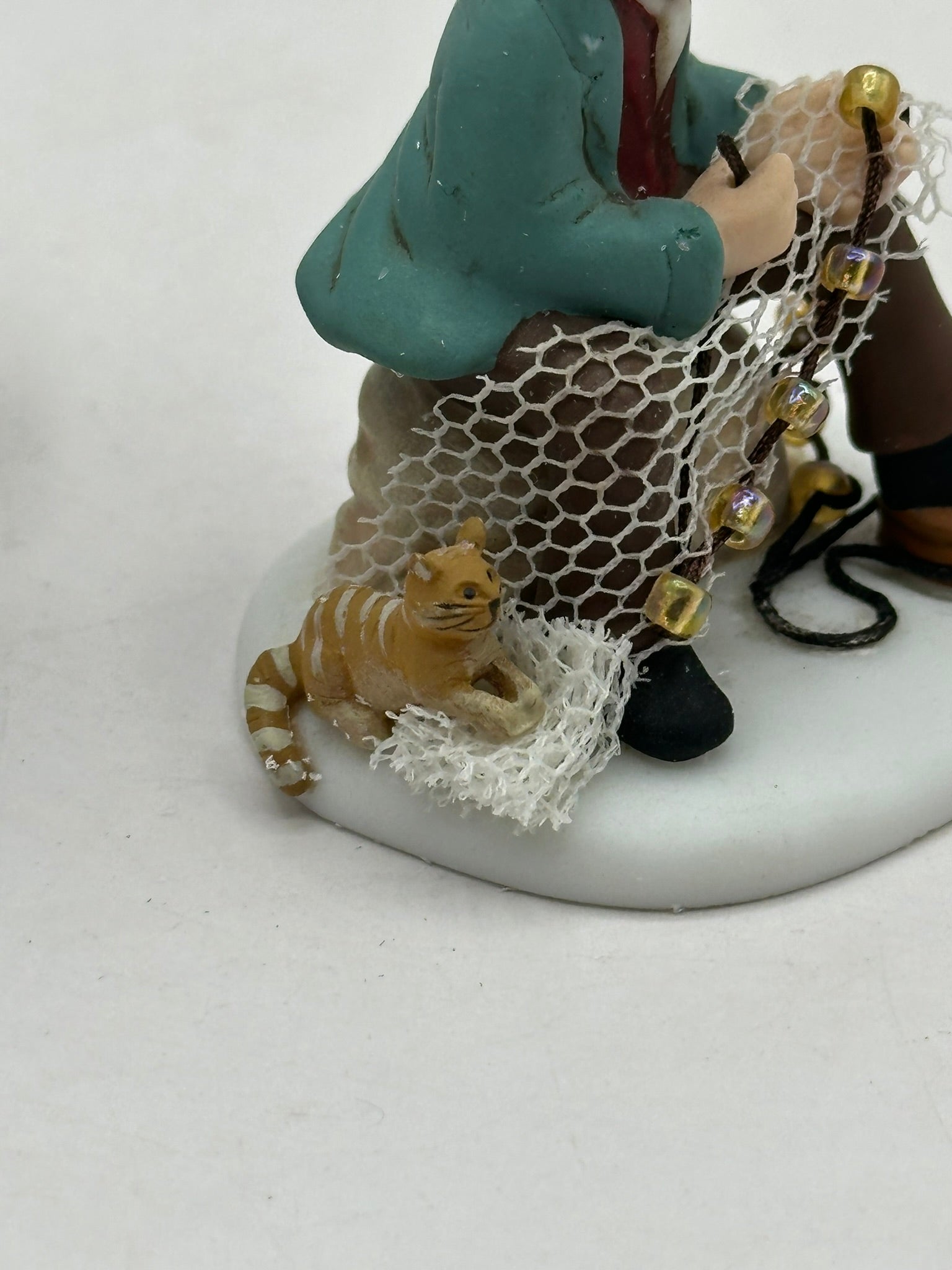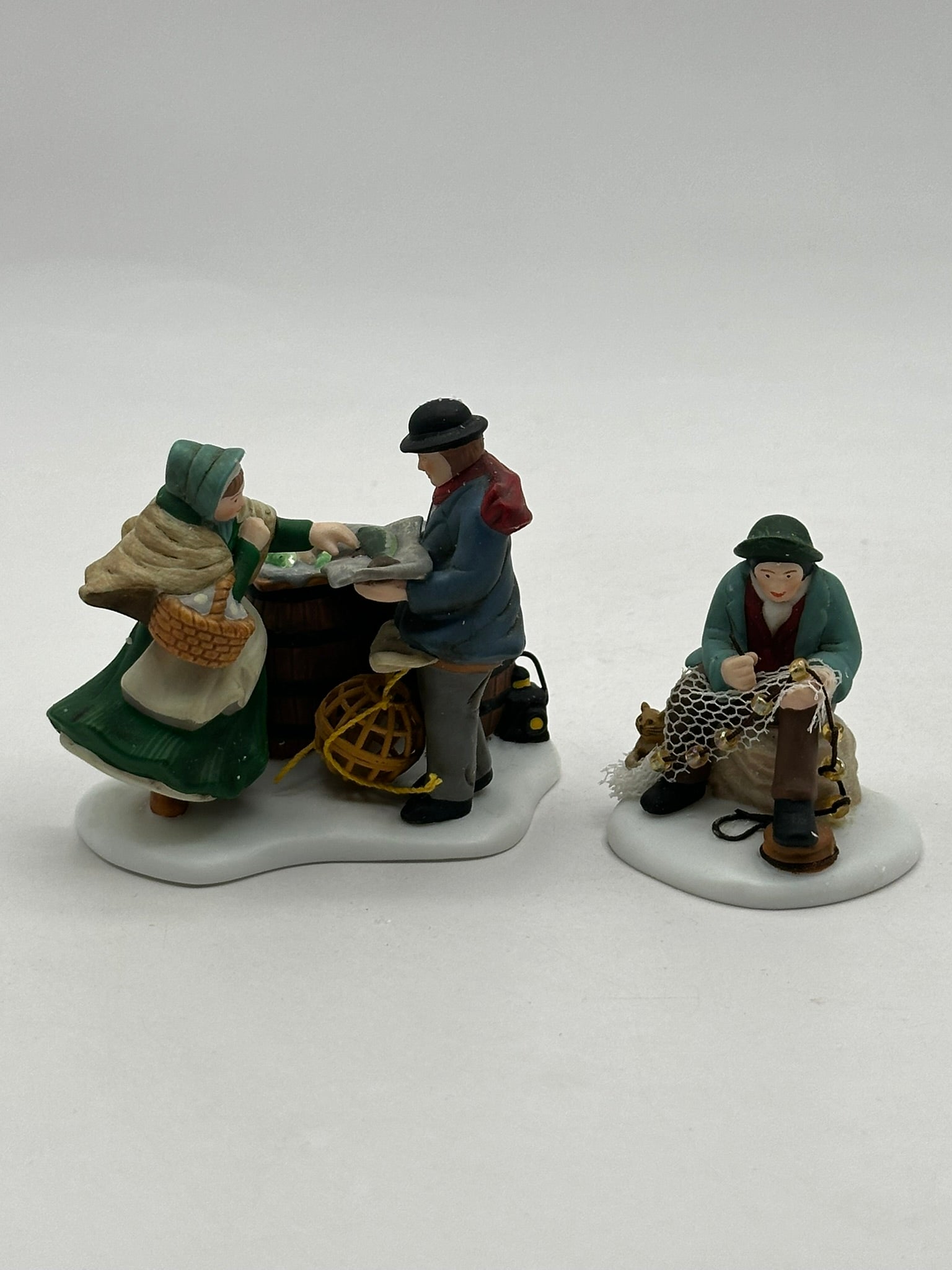 This delightful two-piece set depicts the daily life of hardworking fishermen in Dickensian times. One figure offers the day’s fresh catch to a local customer while another carefully mends his net, preparing for the next outing at sea.