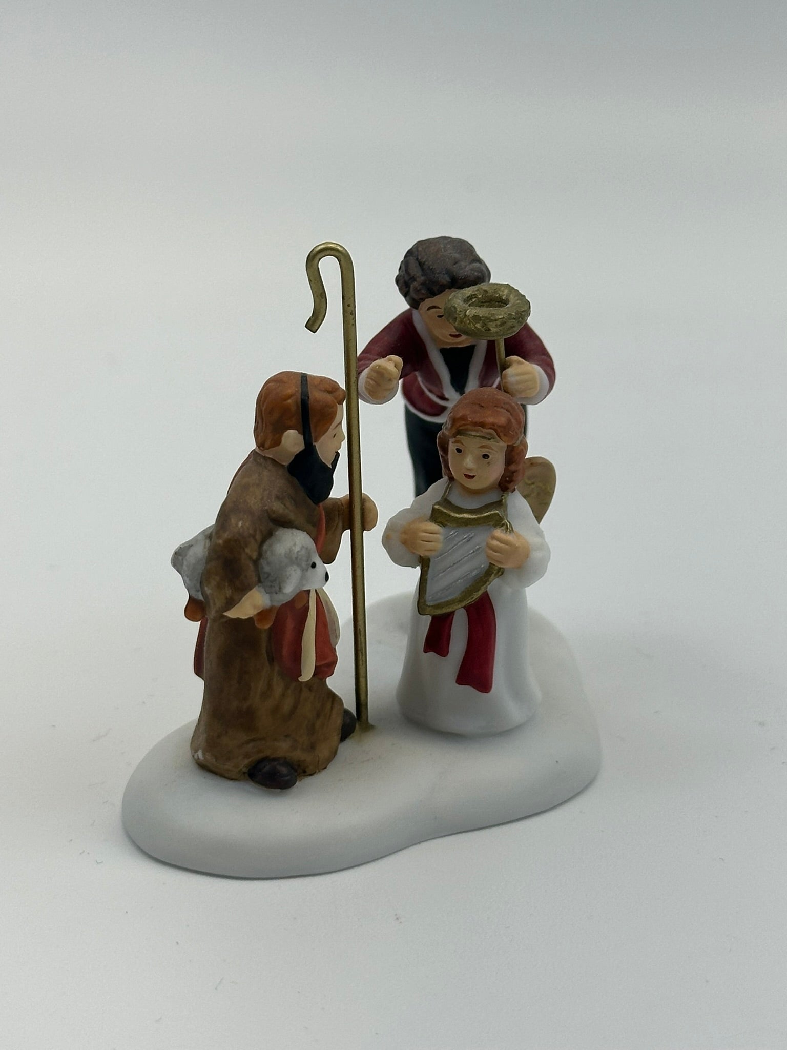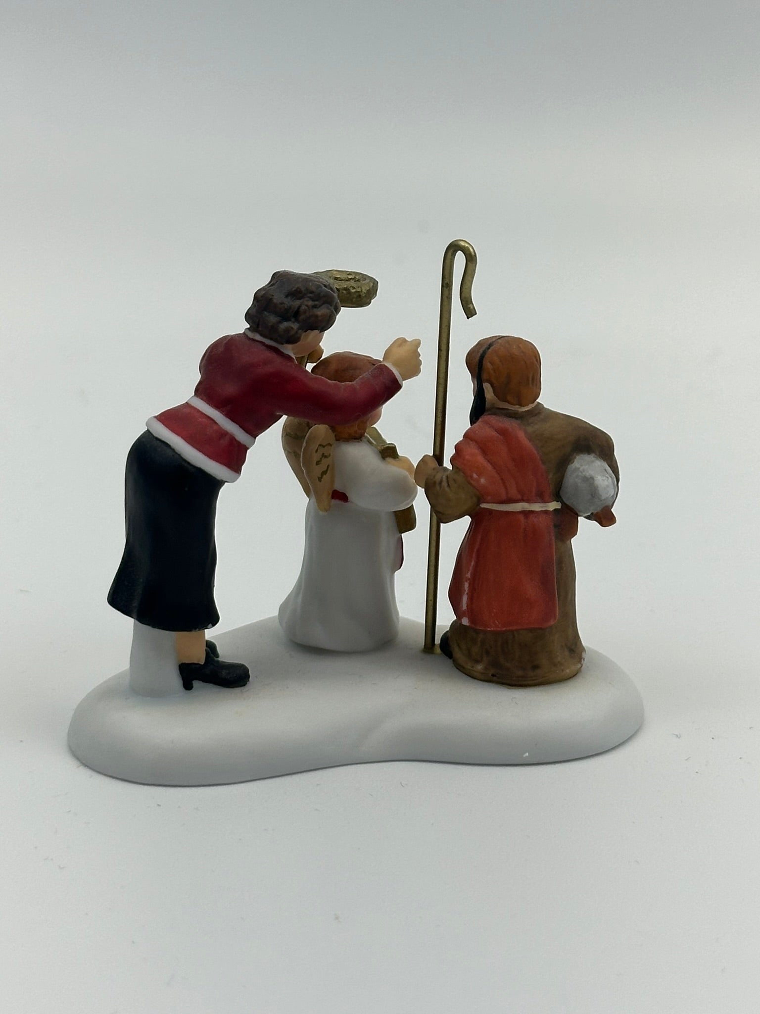 Capture the heartwarming charm of a community holiday tradition with Christmas Pageant Dress Rehearsal. This delightful accessory features a young angel preparing for her role, assisted by an adult adjusting her halo while a shepherd, complete with crook and sheep, stands ready to join the nativity scene. Full of nostalgic detail and seasonal warmth, this piece brings to life the joy and innocence of holiday preparations. A perfect addition to any Christmas in the City village that celebrates family, faith, and festive spirit.