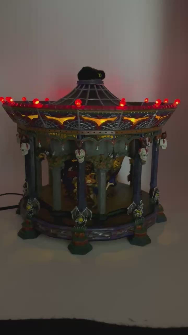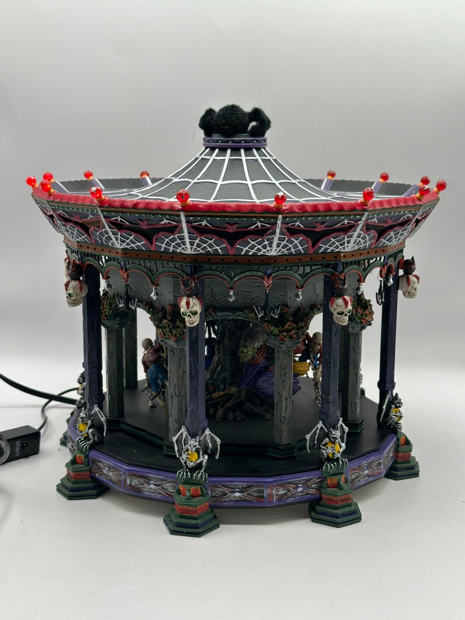 Round and round they go - spirits ride in style on the eerie Ghostly Carousel. This hauntingly detailed animated piece features ghostly figures mounted on skeletal horses, circling beneath a tattered canopy. With soft, spooky lighting and movement, it brings spectral fun and vintage carnival vibes to your Halloween village.