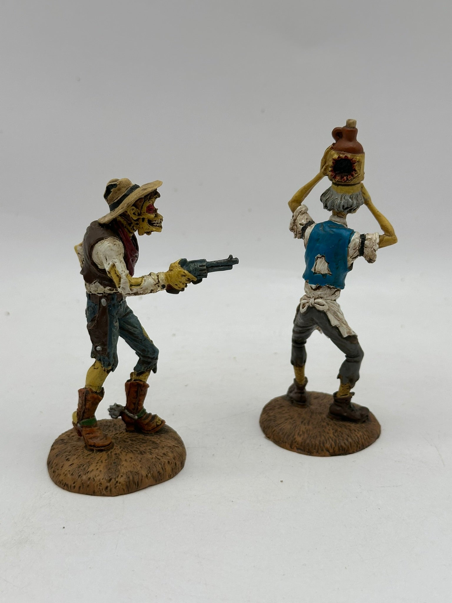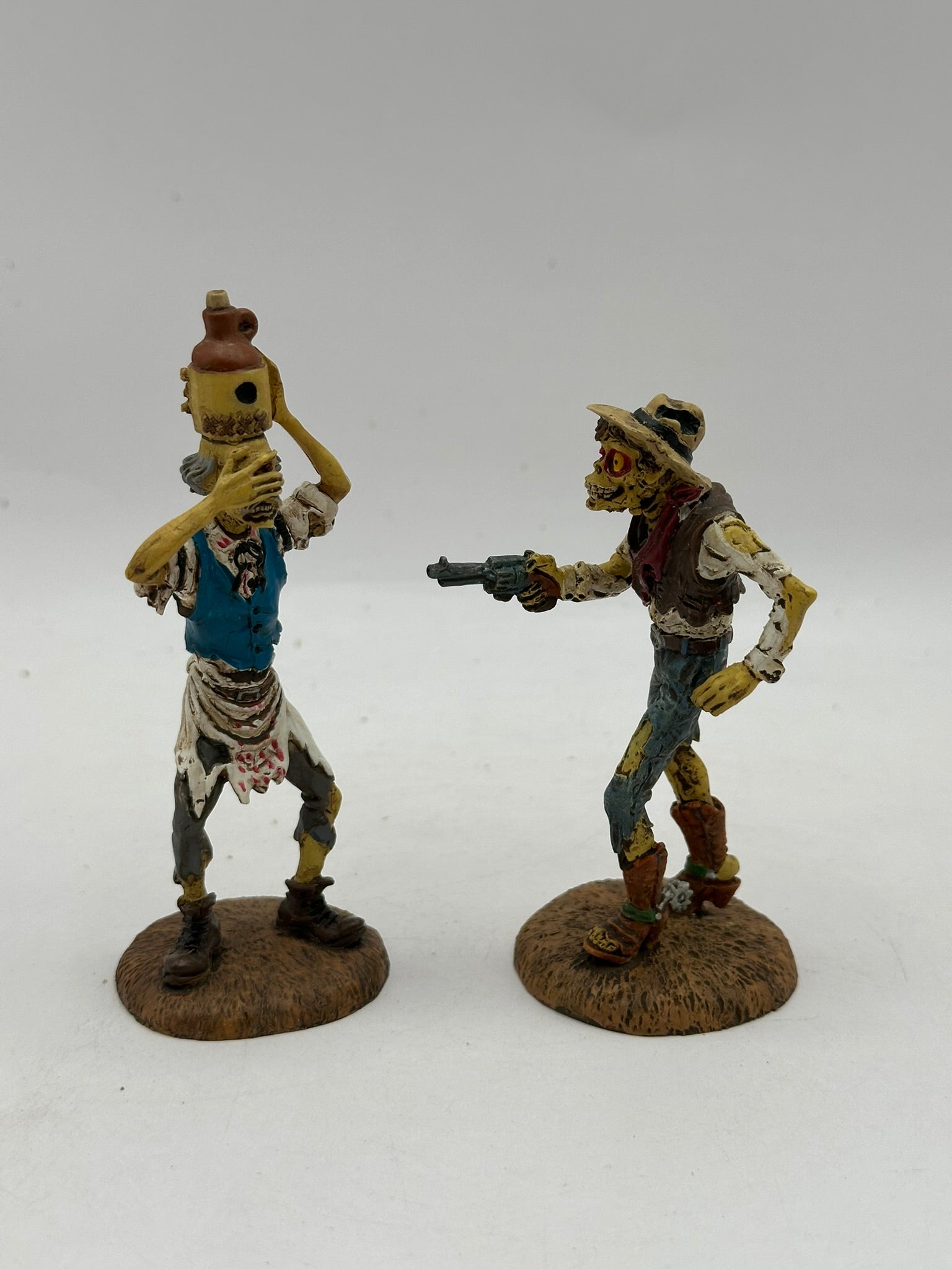 Hold Still… captures a spine‑chilling scene of two skeletal “cowboy” ghouls squaring off in a macabre western standoff - one brandishing a gun, the other clutching a jug - frozen in bone‑rattling suspense. Expertly hand‑crafted and hand‑painted, this retired duo adds eerie authenticity and playful fright to your spooky village display