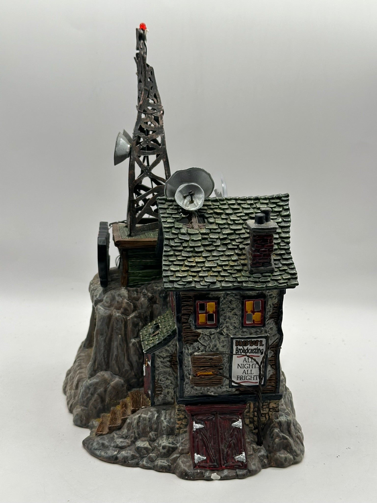 Broadcasting eerie tunes and spooky news across the haunted airwaves, HOWL Radio from Department 56’s Snow Village Halloween series is a standout collectible introduced and retired in 2007. This limited-edition piece features a gothic-style radio station with a crooked broadcast tower, flickering interior lights, and a werewolf DJ howling from the window. With its detailed stone base and quirky charm, it brings a playful yet eerie vibe to any Halloween village display, and is now a rare find for serious collectors.
