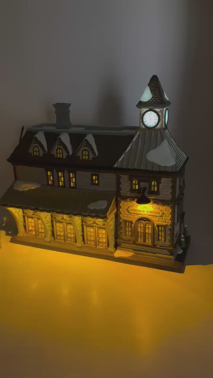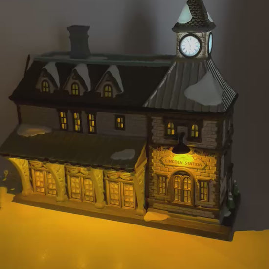 All aboard for holiday travel at Lincoln Station, part of the Christmas in the City series by Department 56. This beautifully detailed building captures the charm of a classic urban train station, complete with arched windows, a prominent clock tower, and a snow-dusted rooftop. Festive garlands decorate the green pillars and trim, while warm light glows from within, inviting passengers and visitors alike. A timeless centerpiece for any cityscape, Lincoln Station brings movement, nostalgia, and architectural elegance to your village display.