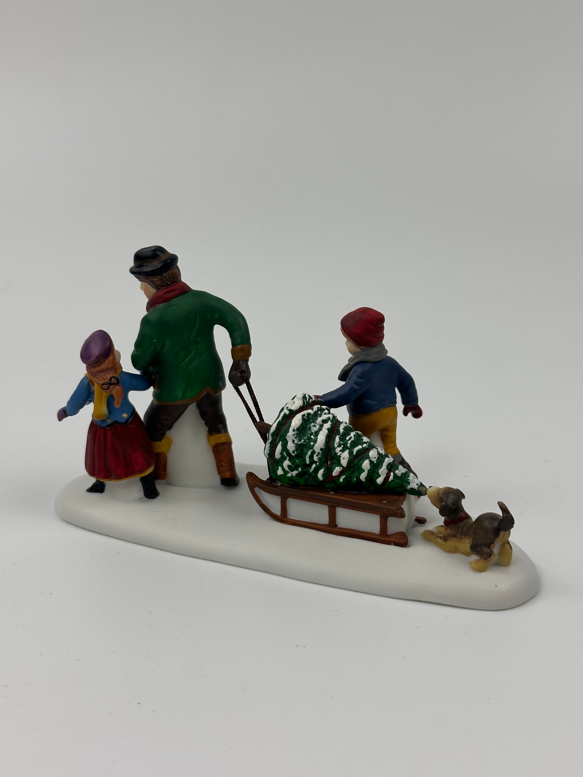Celebrate timeless holiday traditions with The Family Tree, a heartwarming accessory from Department 56. This charming scene features a joyful family returning from their annual Christmas tree outing. Dad pulls the freshly chosen tree on a wooden sled while the kids bundle up for the winter walk home, full of smiles and holiday spirit. With a dog following closely behind, this piece captures the essence of togetherness.